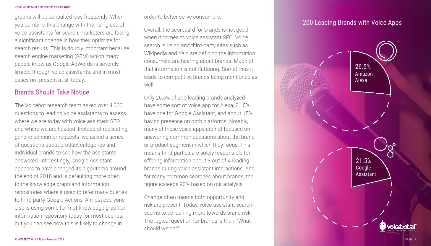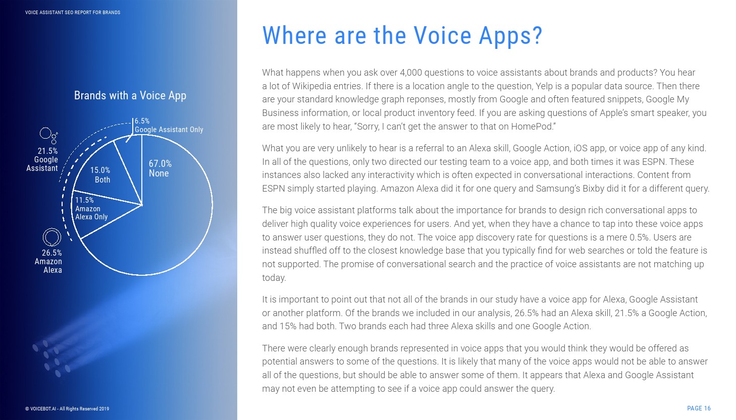 Voicebot.ai研究中的所有品牌都有Alexa、Google Assistant或其他平台的语音应用。其中26.5%支持Alexa,21.5%支持Google Action,15%两者兼有。