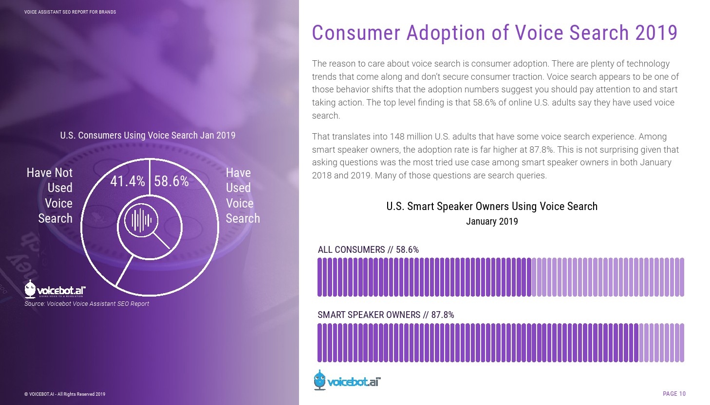 2019年,58.6%的美国成年网民使用语音搜索,这相当于1.48亿美国成年人拥有一些语音搜索体验。在智能音箱用户中,语音搜索的普及率要高得多,达到87.8%。