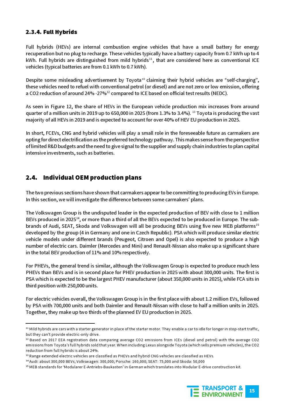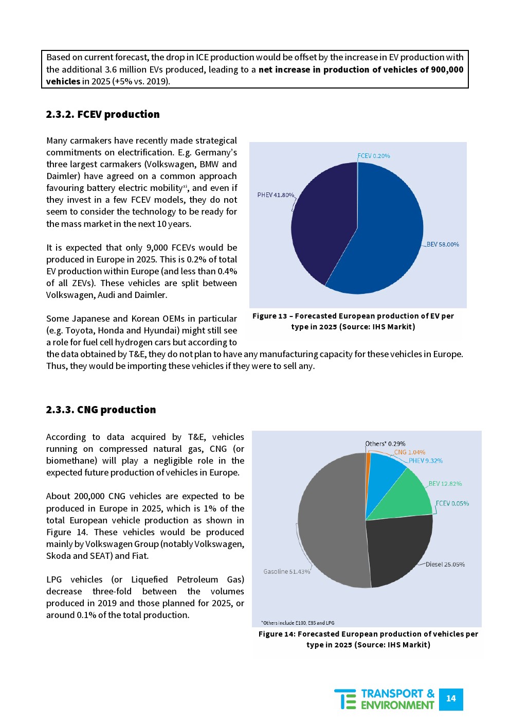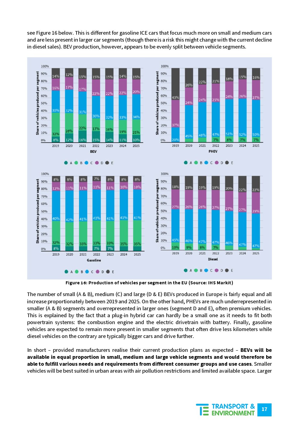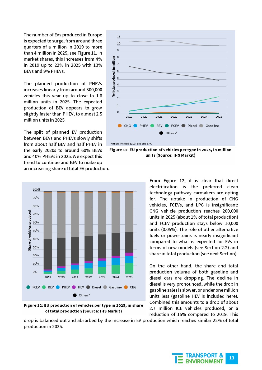 根据欧盟运输与环境联合会获得的轻型汽车生产预测数据和内部分析,预计2019-2025年,欧洲电动汽车的产量将增长6倍,达到400多万辆,超过欧盟汽车产量的1/5。如果汽车制造商坚持他们的计划,这将足以满足欧盟最近商定的2025年汽车二氧化碳排放标准,或者至少在2025年达到15%。