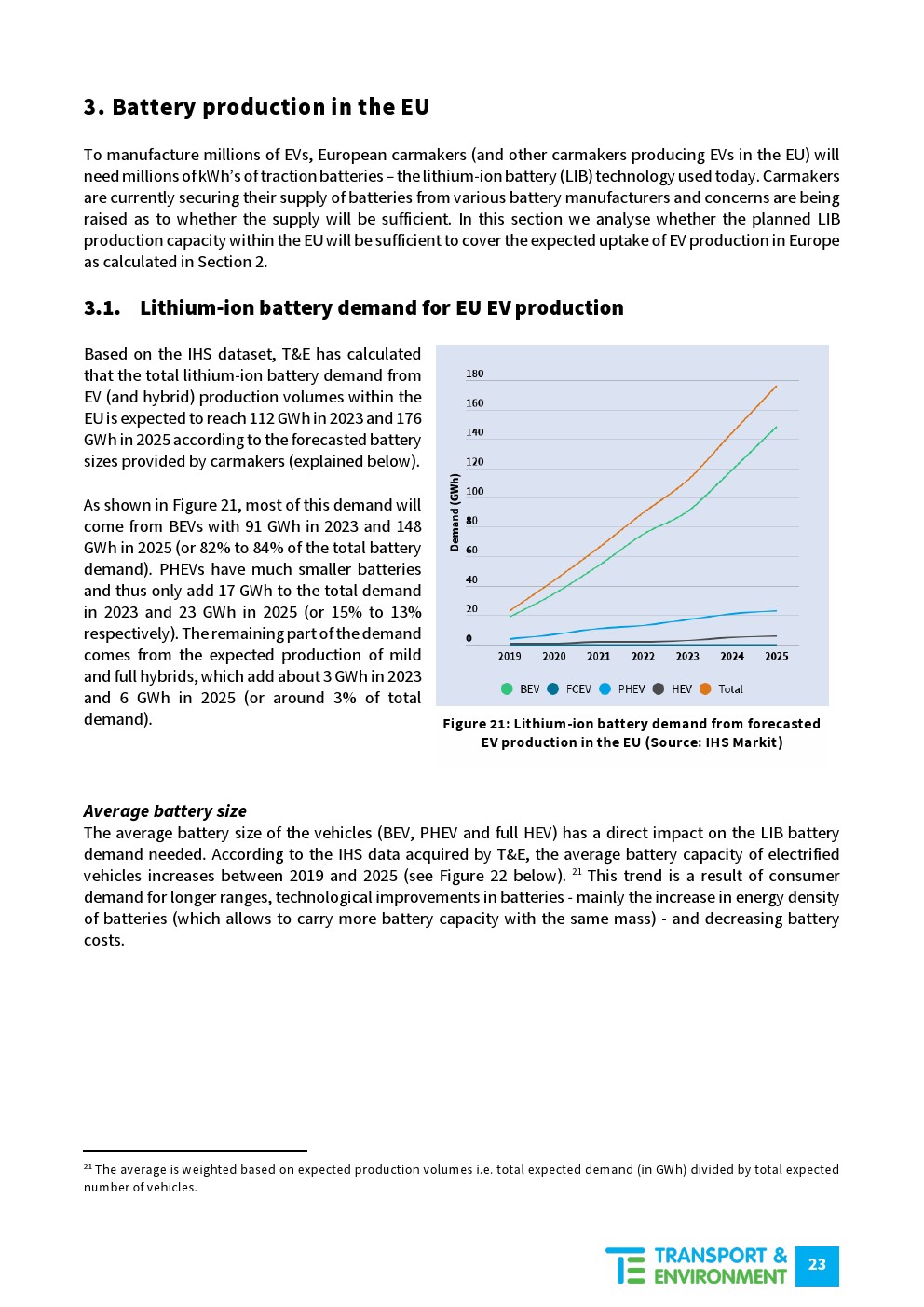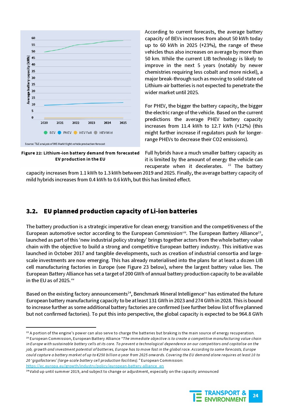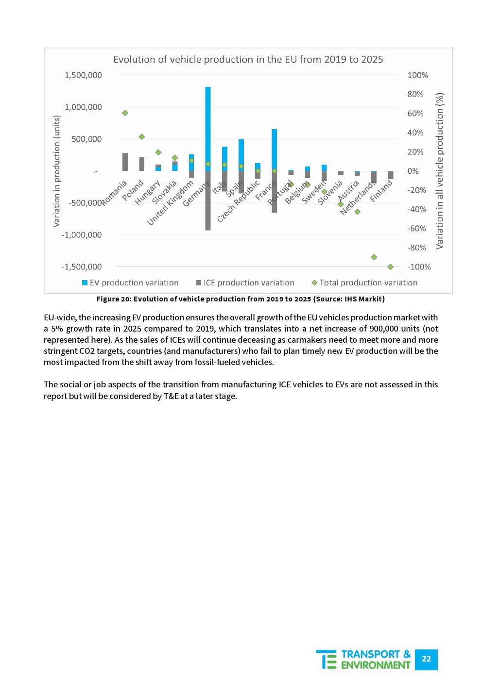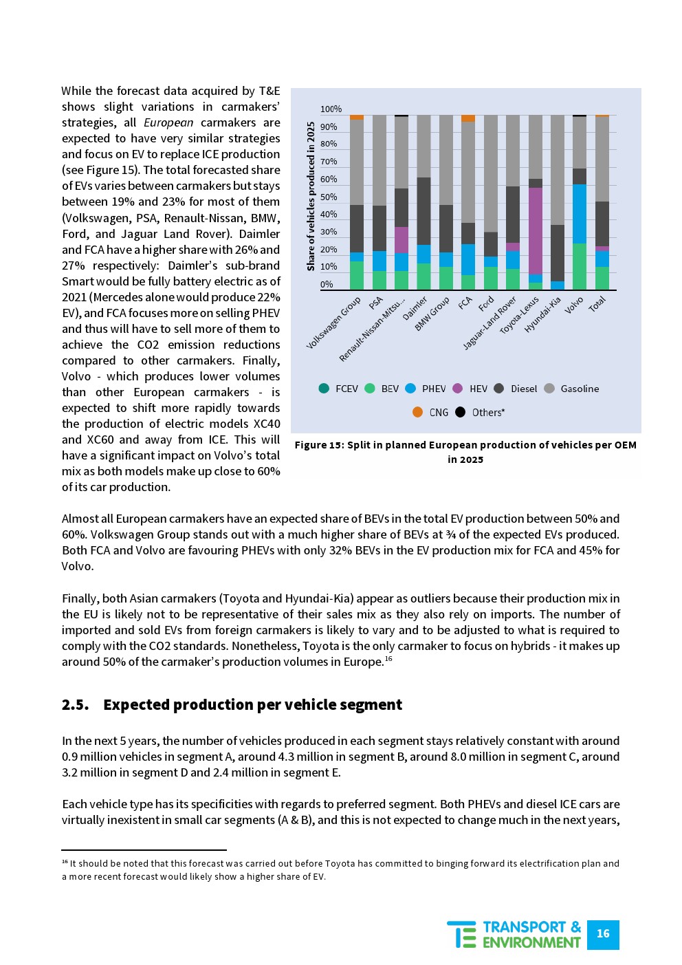 根据欧盟运输与环境联合会获得的轻型汽车生产预测数据和内部分析,预计2019-2025年,欧洲电动汽车的产量将增长6倍,达到400多万辆,超过欧盟汽车产量的1/5。如果汽车制造商坚持他们的计划,这将足以满足欧盟最近商定的2025年汽车二氧化碳排放标准,或者至少在2025年达到15%。