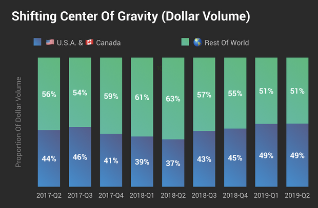 根据Crunchbase的预测,2019年前两个季度,北美初创企业吸引了全球风险投资总额的49%,远远高于2018年的总额。