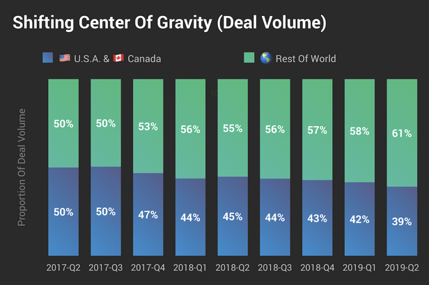 根据Crunchbase的预测,2019年第二季度,美国和加拿大公司占种子风险投资的39%。这是两年来的最小份额,远低于两年前创下的水平(50%)。