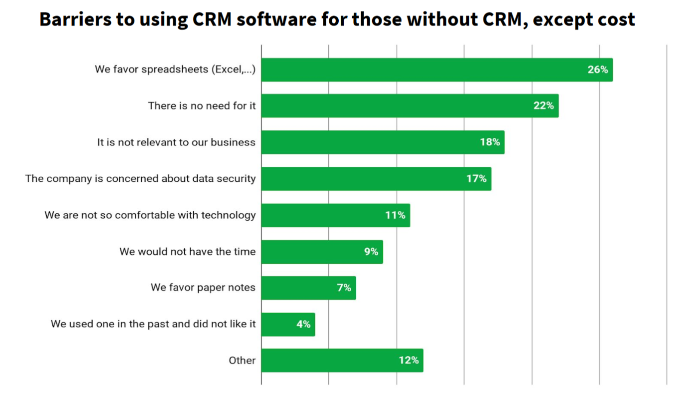 在不考虑成本因素的情况下,不使用CRM的受访者中有1/4(26%)表示他们更喜欢使用Excel等电子表格,22%表示没有必要,18%表示CRM与其业务无关。数据安全(17%)和对技术不熟悉(11%)是使用CRM的其他障碍,只有4%的受访者表示他们不使用CRM是因为他们过去使用过但不喜欢。