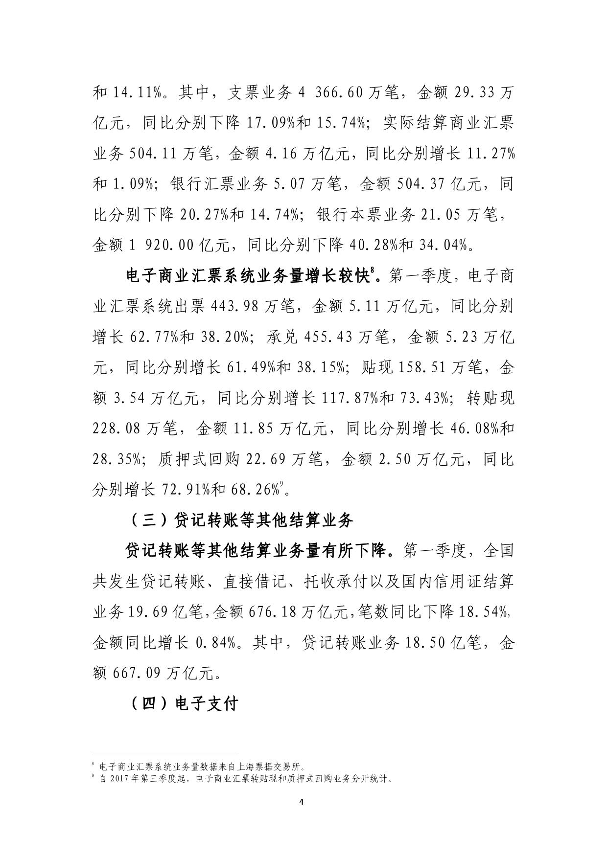 商业汇票业务量小幅增长。第一季度,全国共发生票据业务4896.84万笔,金额33.73万亿元,同比分别下降15.00%和14.11%。其中,支票业务4366.60万笔,金额29.33万亿元,同比分别下降17.09%和15.74%;实际结算商业汇票业务504.11 万笔,金额4.16万亿元,同比分别增长11.27%和1.09%;银行汇票业务5.07万笔,金额504.37 亿元,同比分别下降20.27%和14.74%;银行本票业务21.05 万笔,金额1920.00 亿元,同比分别下降40.28%和34.04%。电子商业汇票系统业务量增长较快。第一季度,电子商业汇票系统出票443.98万笔,金额5.11万亿元,同比分别增长62.77%和38.20%;承兑455.43万笔,金额5.23万亿元,同比分别增长61.49%和38.15%;贴现158.51万笔,金额3.54万亿元,同比分别增长117.87%和73.43%;转贴现228.08万笔,金额11.85万亿元,同比分别增长46.08%和28.35%;质押式回购22.69万笔,金额2.50万亿元,同比分别增长72.91%和68.26%。