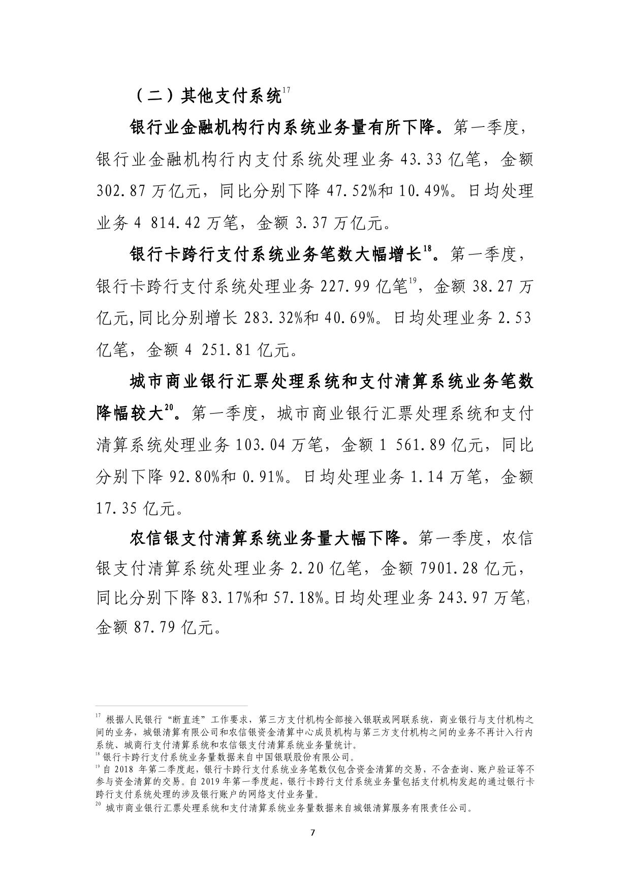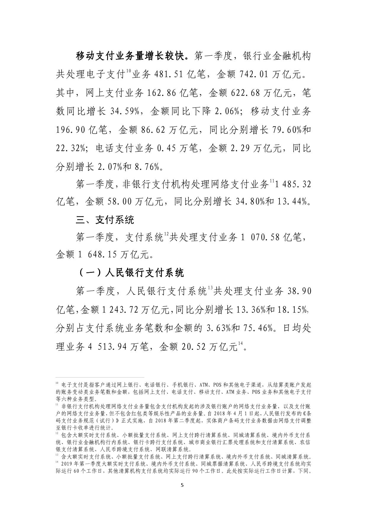2019 年第一季度支付业务统计数据显示,全国支付体系运行平稳,社会资金交易规模不断扩大,支付业务量保持稳步增长。