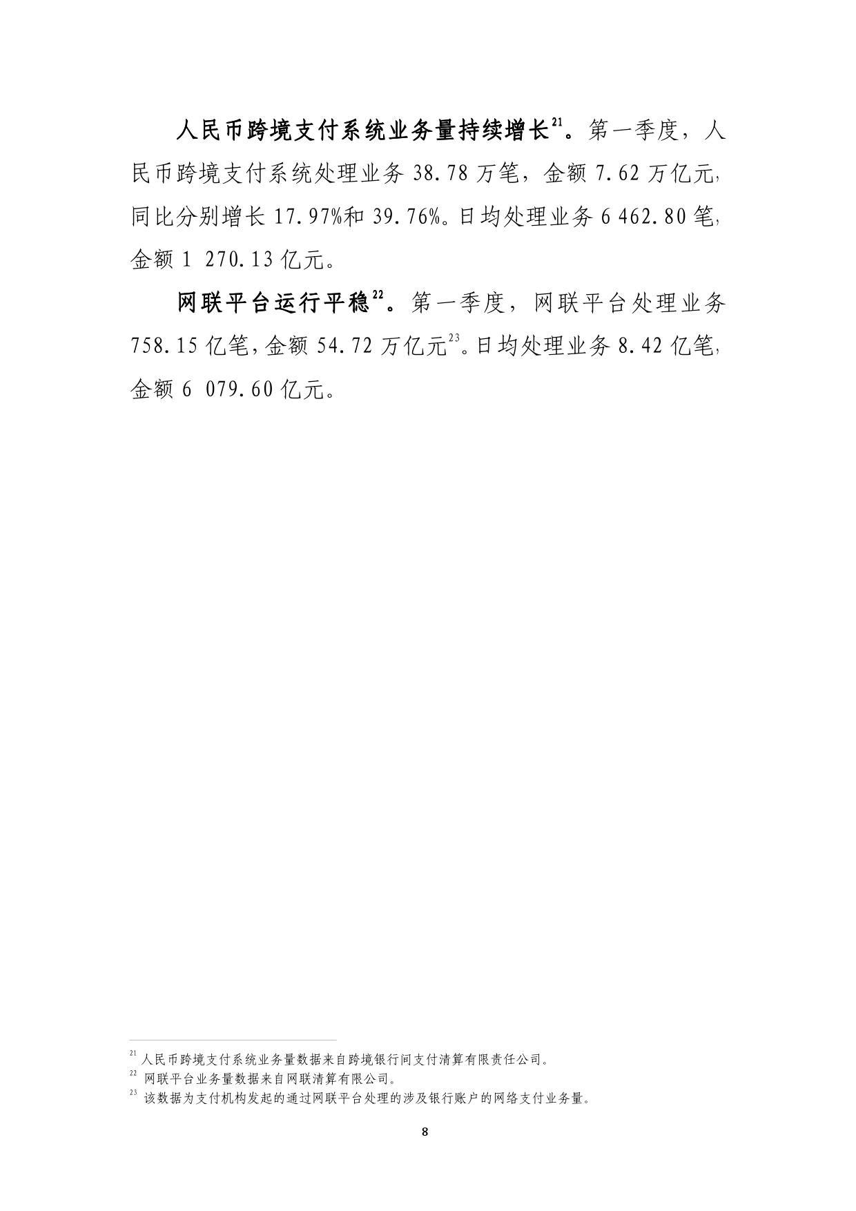 人民币跨境支付系统业务量持续增长。第一季度,人民币跨境支付系统处理业务38.78 万笔,金额7.62万亿元,同比分别增长17.97%和39.76%。日均处理业务6462.80笔,金额1270.13亿元。