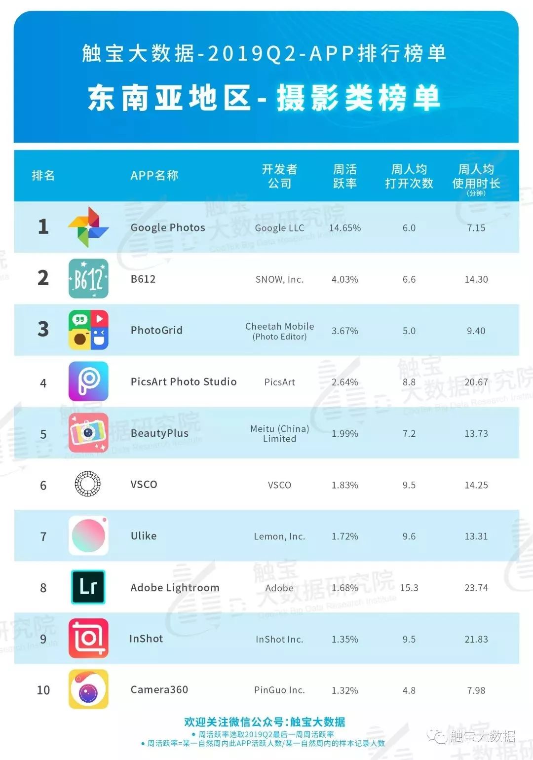 东南亚摄影类精品化的趋势仍在进一步深入,以 VSCO 为代表的精品化图片编辑应用,在本季度使用时长、活跃度都有一定的升级。图片编辑应用 InShot 首次入榜,图片编辑应用的普及一方面与手机存储及显示功能的优化有关,另一方面手机能够取代这类内容,如果能与社交或视频元素进行结合,也将会获得用户的更大粘性。