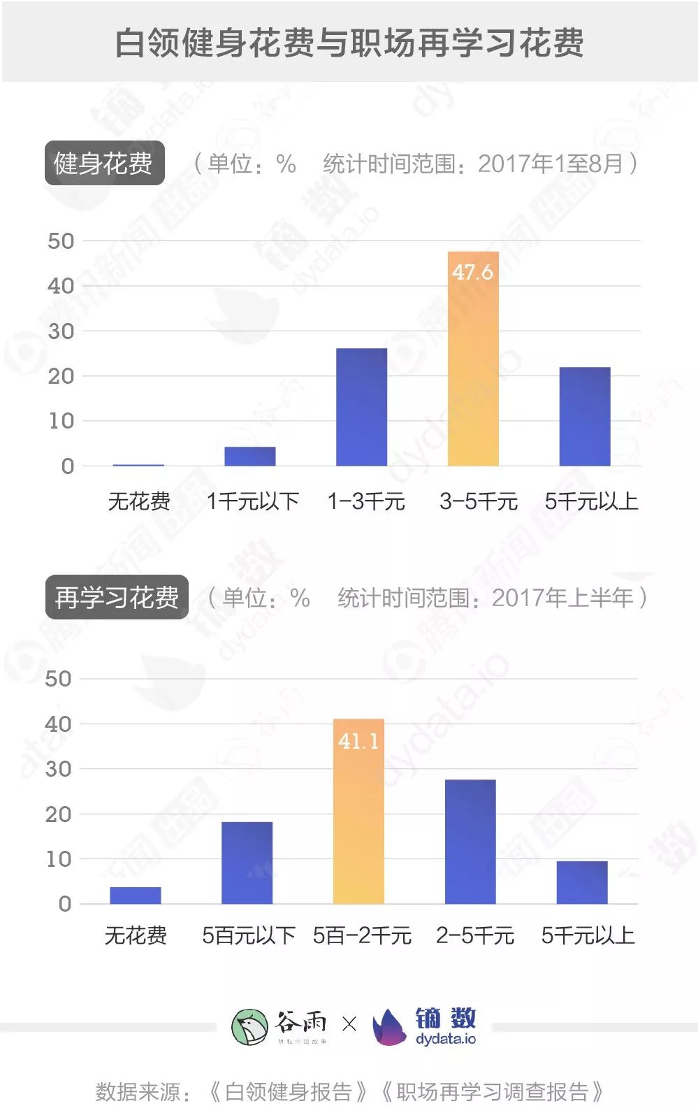 在2017年不到一年的时间里,白领们在健身房的花费3000-5000元的人最多,占47.6%,基本上是高档连锁型健身房一张年卡的价格。还有21.9%的人花费在5000元以上,应该包括请私教的费用。
