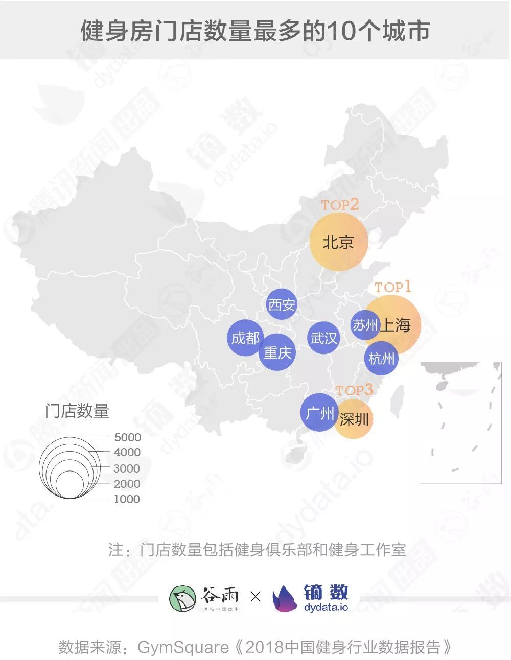 健身内容平台GymSquare发布的《2018中国健身行业数据报告》显示,上海、北京、深圳是中国健身房最多的三个城市,其中上海和北京的门店数量均超过4500家,遥遥领先。