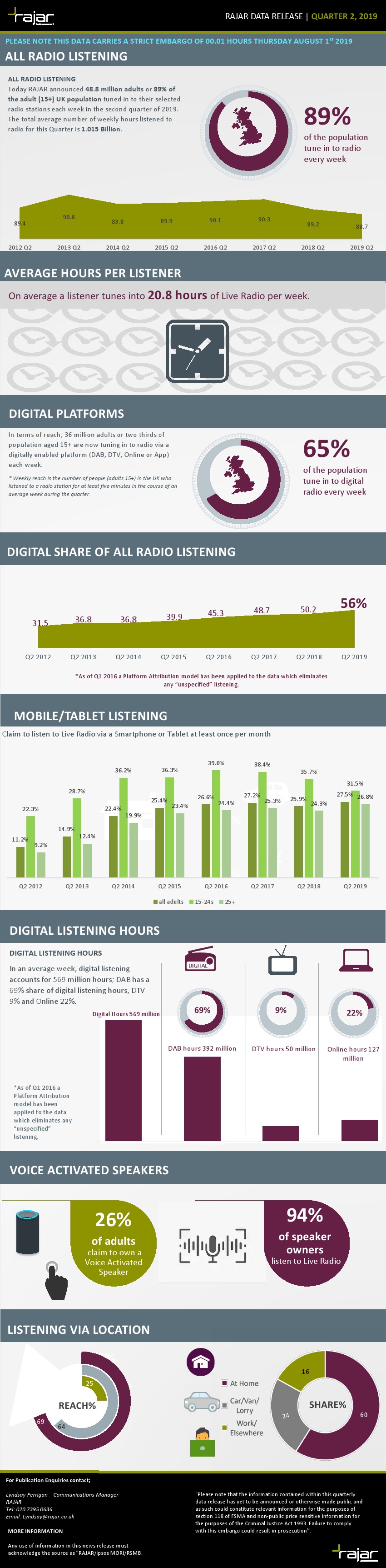 平均而言,听众每周收听20.8小时的现场广播。3600万成年人(占总人口的65%)通过数字平台收听,如DAB、DTV、网站或应用。根据RAJAR的数据,网络的重要性日益增长的另一个迹象是其在所有无线电收听中的份额在第二季度达到56%,高于2018年第二季度的50.2%和2017年第二季度的48.7%。