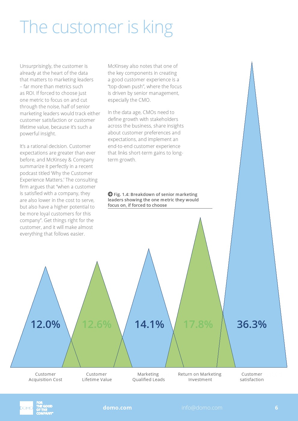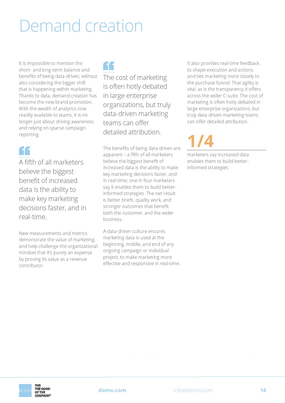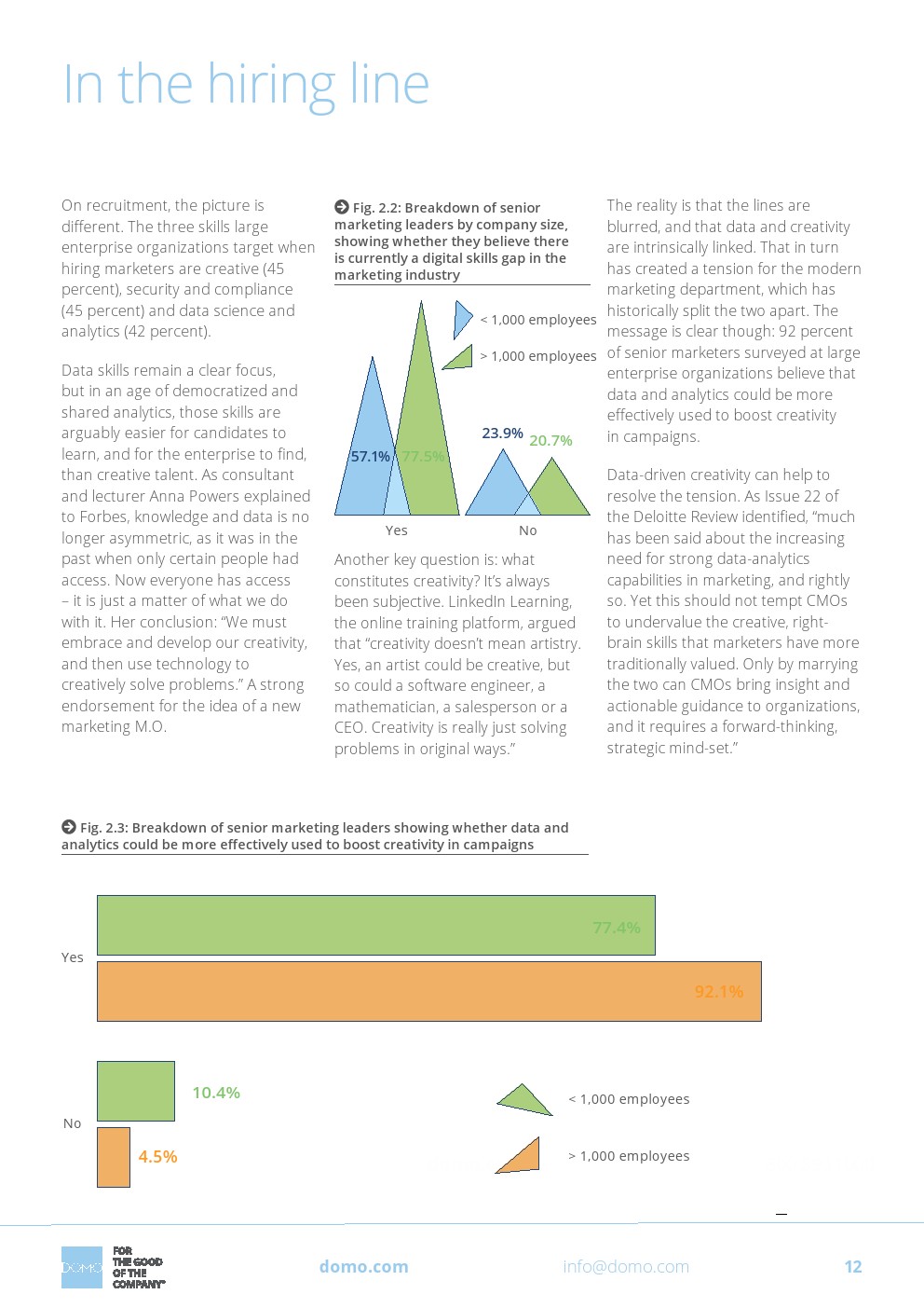 对于大多数较大的公司(64.3%)来说,强大的数据和分析是现代营销部门最重要的技能,领先于创造性技能。然而,来自小企业的营销领导者更倾向于看到创意和数据技能平衡的价值。