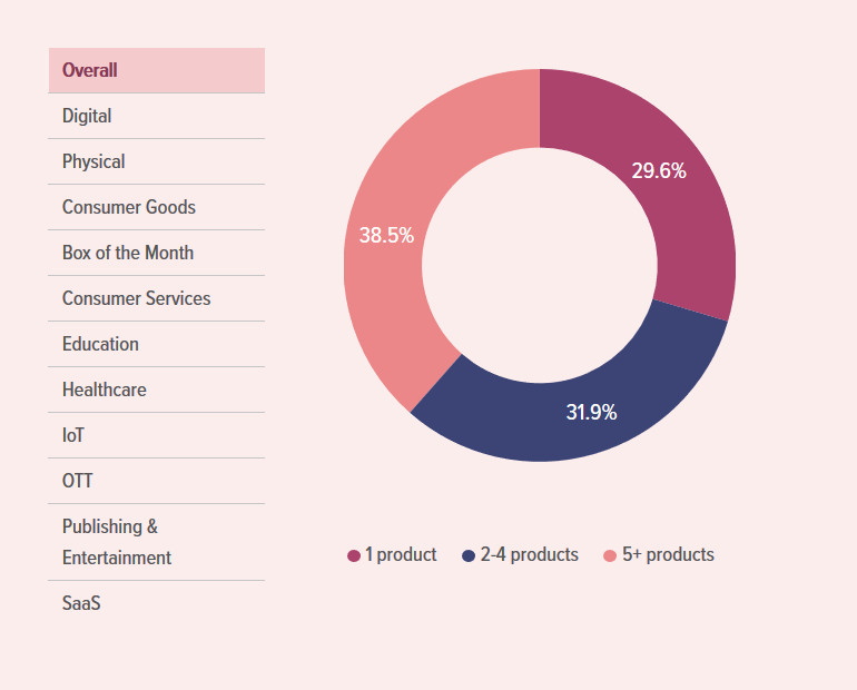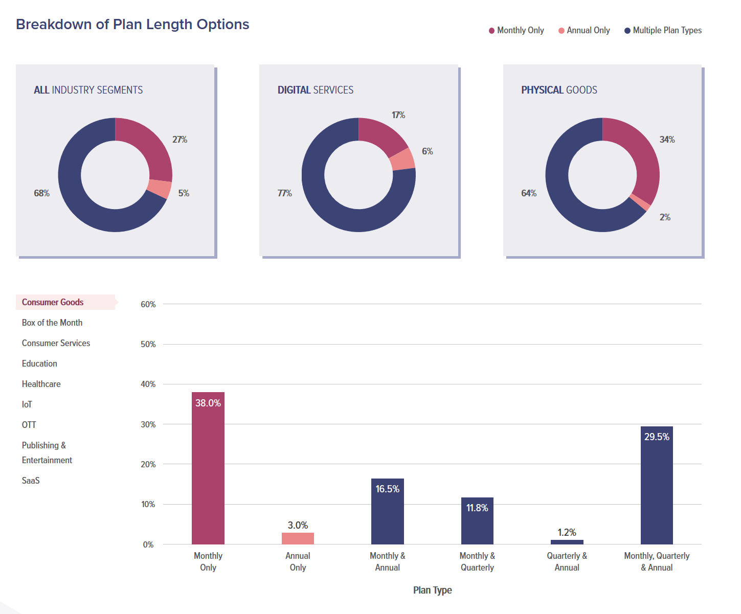 消费品订阅最有可能仅提供按月(38%),但3/10企业(29.5%)提供全套订阅选项(月度、季度和年度)。只有3%的企业提供仅限年度计划。