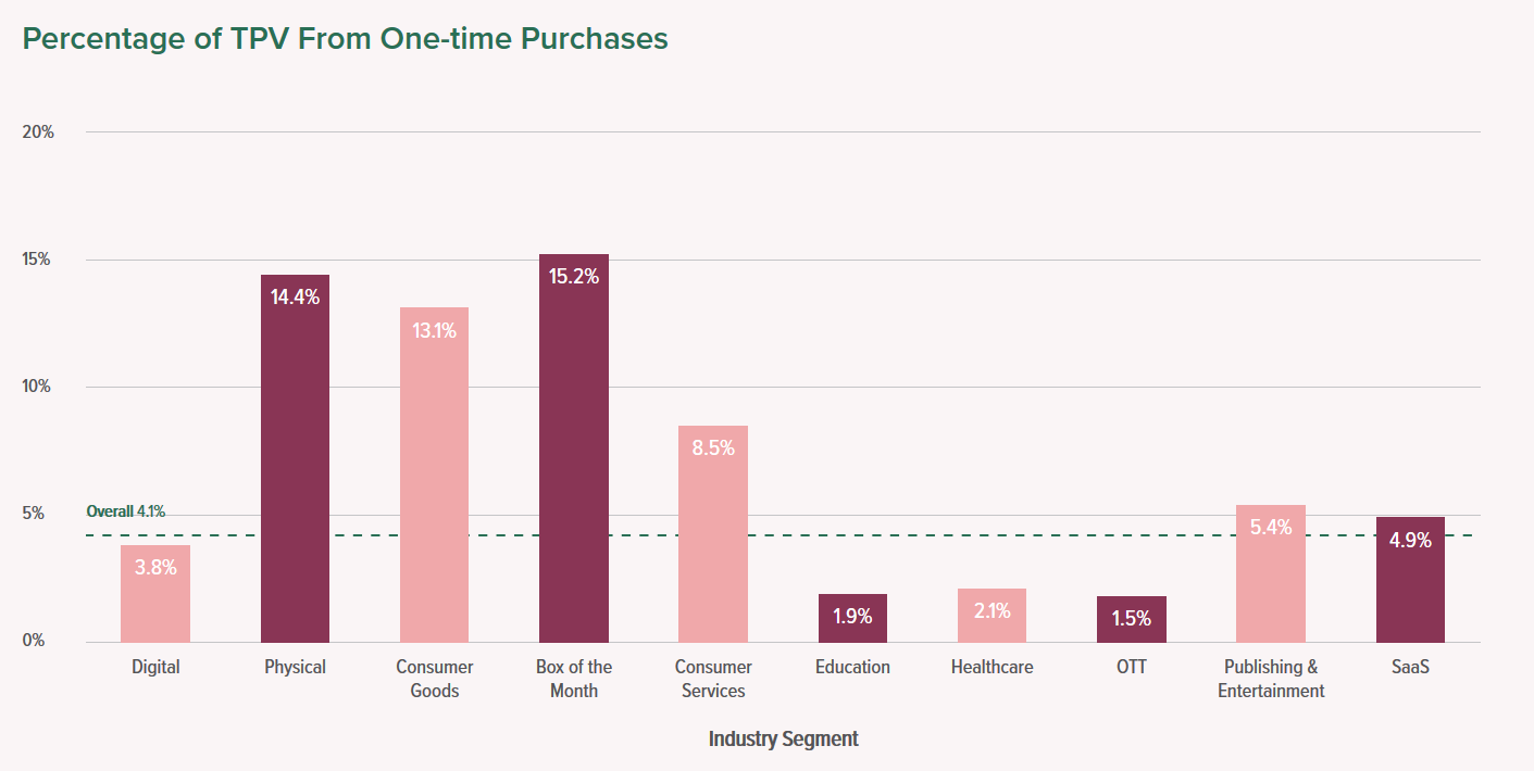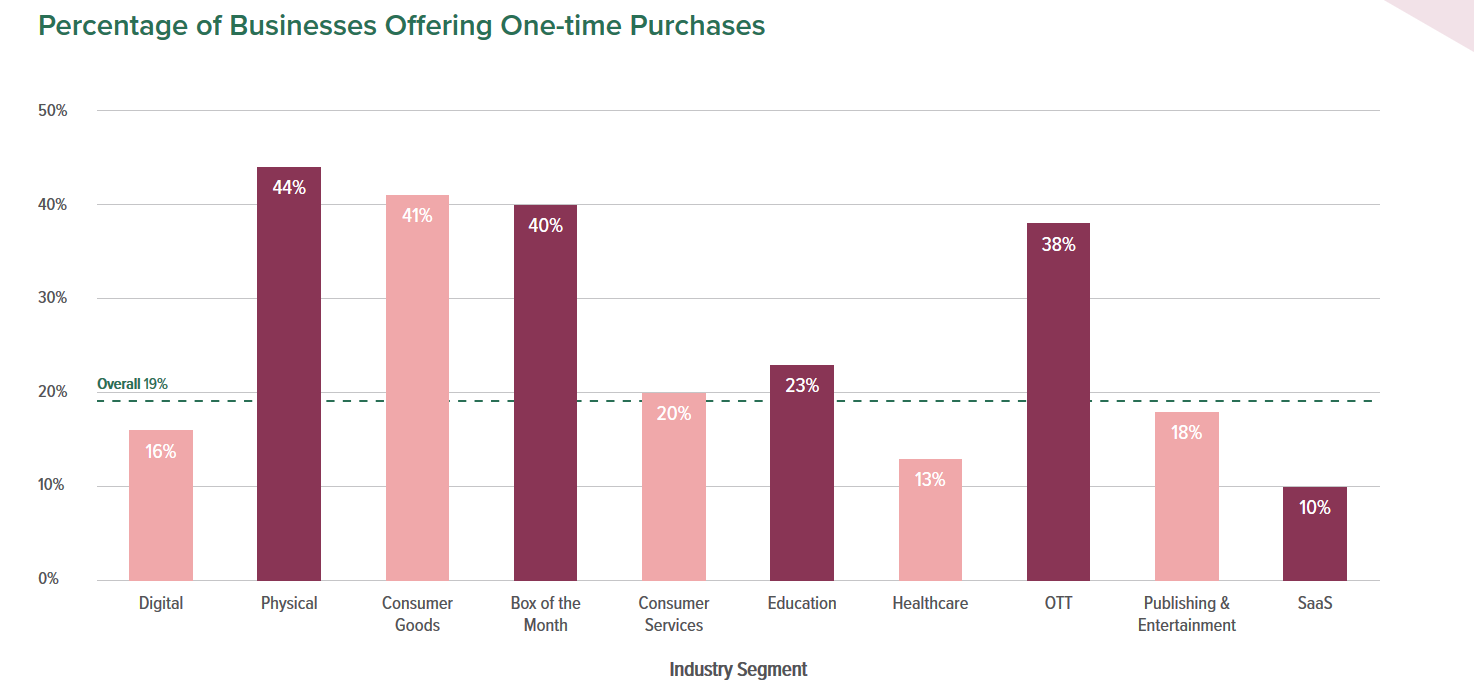 约19%的提供订阅服务的企业还包括一次性购买选项。提供实物的行业(44%)比数字行业(16%)更普遍。OTT行业是个例外,超过1/3的企业(38%)提供一次性购买,仅略低于提供相同服务的消费品企业的41%。
