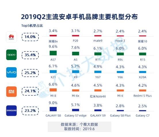 个推大数据显示,2019年Q2季度华为手机市占率26.0%,继续领跑国产智能手机市场。OV手机分别以22.2%和20.2%的市占率位列第二、第三名。