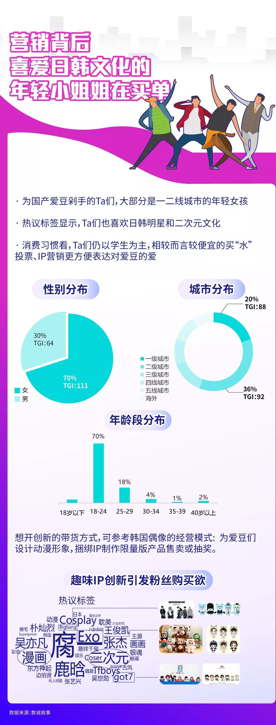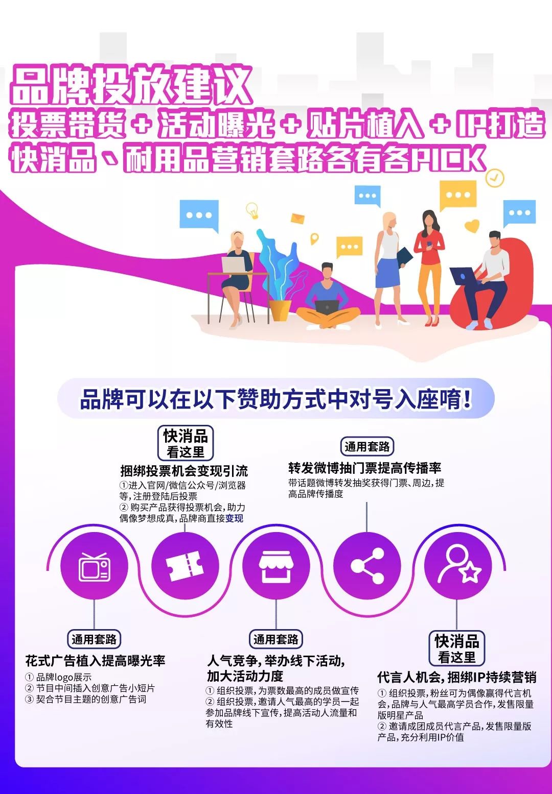 - 瞄准强购买力粉丝经济的偶像养成选秀,快消品适合“直接变现”,降低消费门槛,创造能支持偶像的产品;耐用品适合“曲线变现”,IP代言、限量周边能激活少女心;