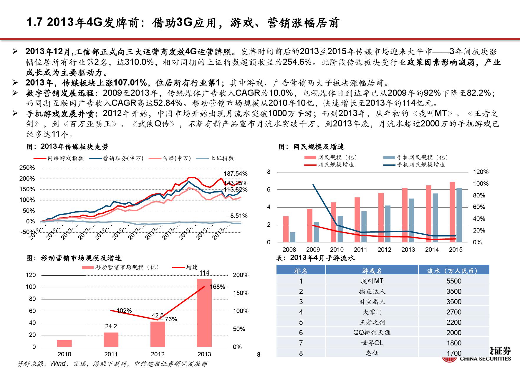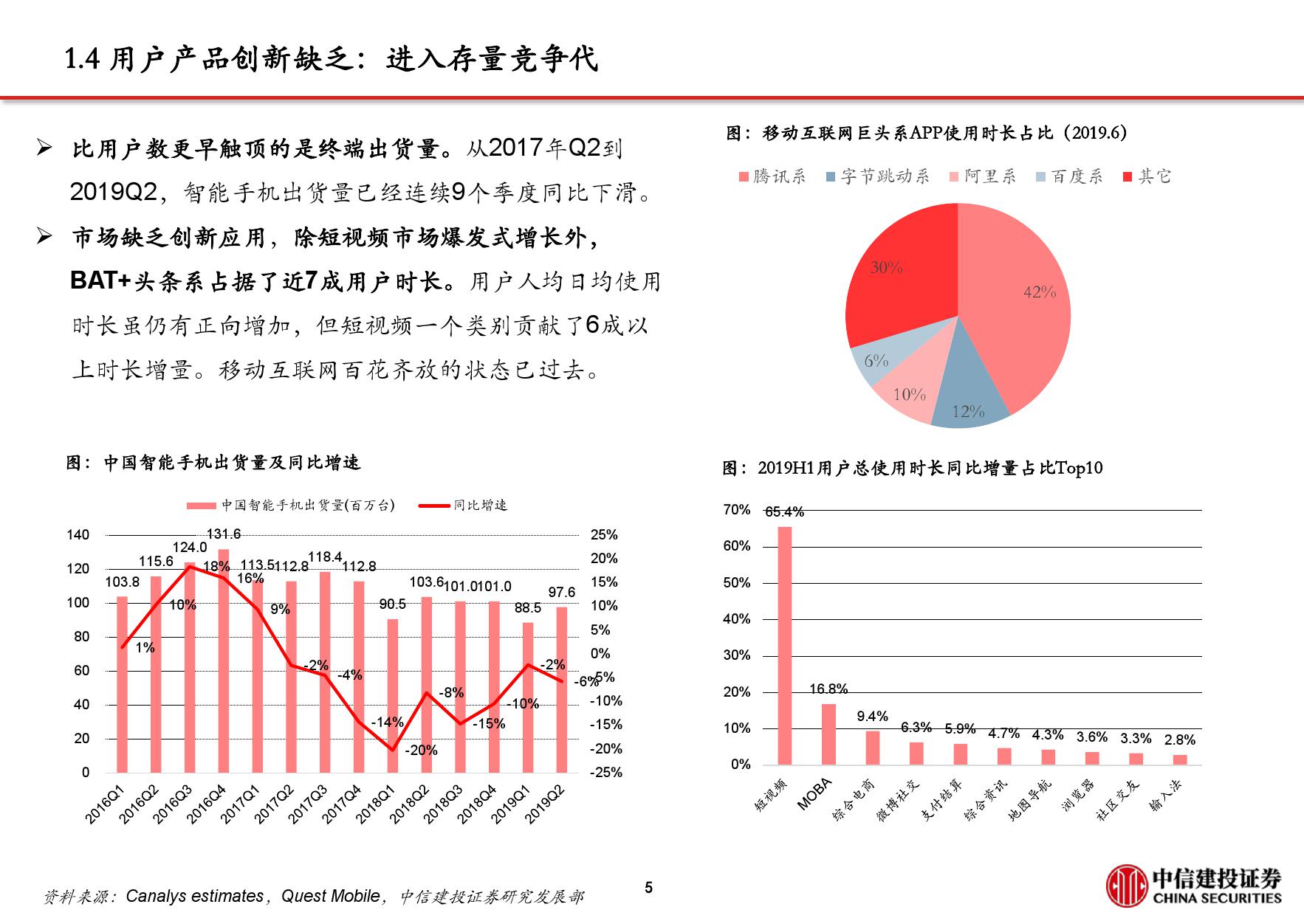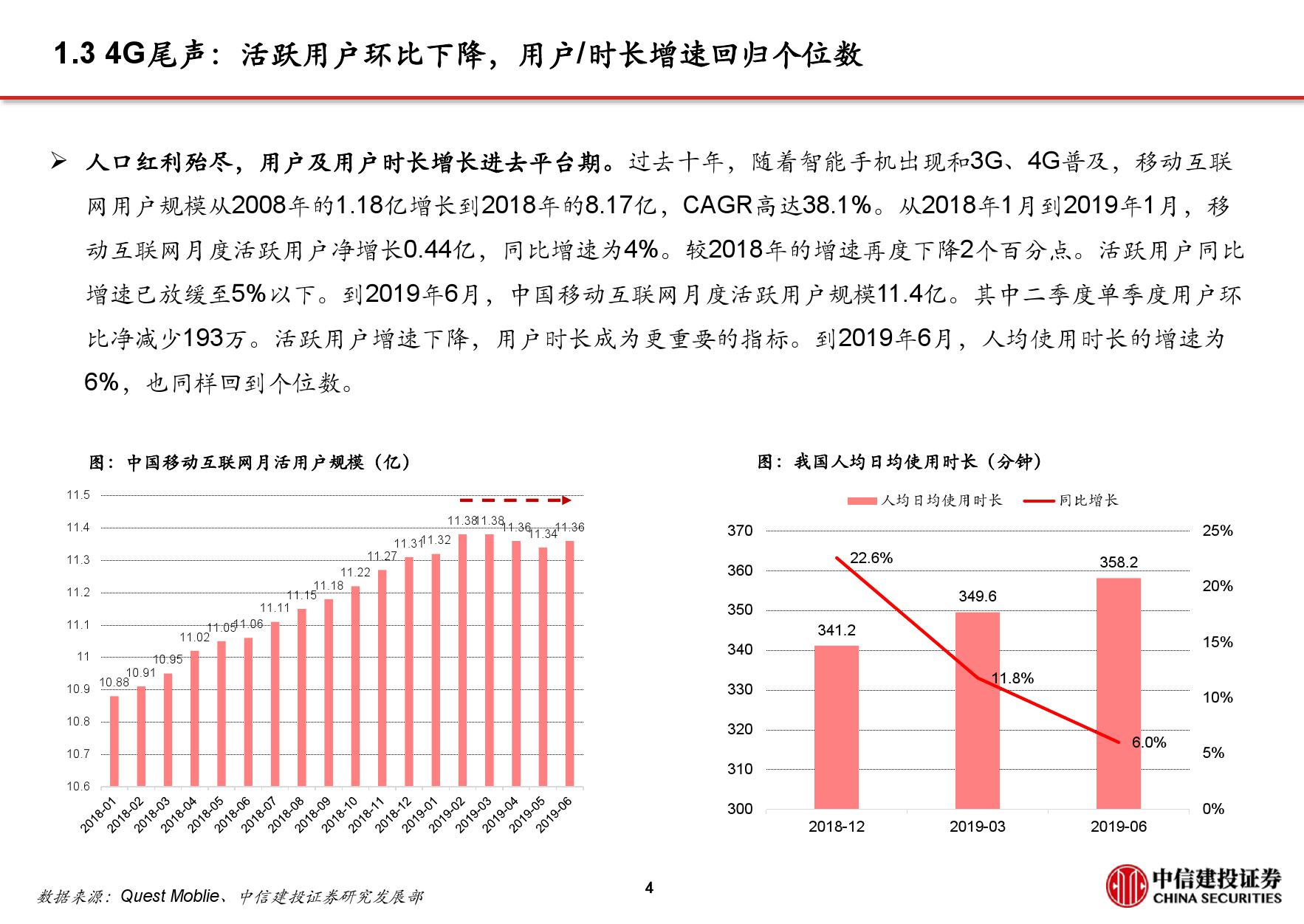 移动通信技术发展推动应用端内容生产和消费形式持续更新,5G有望催生更丰富的娱乐消费。1G是一种仅限语音的蜂窝电话标准,使用范围小,风险性大且传输速度慢;2G实现了无线数字通信,包括客户化应用移动网络增强逻辑,同时话音质量也得到了很大改进,但依然无法支持视频、图画;3G相对于第二代移动通信传输速度有了很大提升,最快的速度可以达到500kbps,流速的提升为图像、音乐、视频流等多种媒体形式的实现提供了可能,同时多媒体业务处理也使得流量体量暴发式增长到2G时代的8倍以上;4G网络在3G基础上对WLAN进行了融合,可以传输与电脑图像质量相当的视频,能够以100Mbps的速度进行下载,比家用的4M宽带快25倍,流量体量由于应用端高流量消耗的功能开启,较3G时增长近100余倍,短视频、移动视频直播应运而生;5G时代更高的流速以及更大的流量将催生更高质量的超高清视频以及更低延时的云VR/AR。