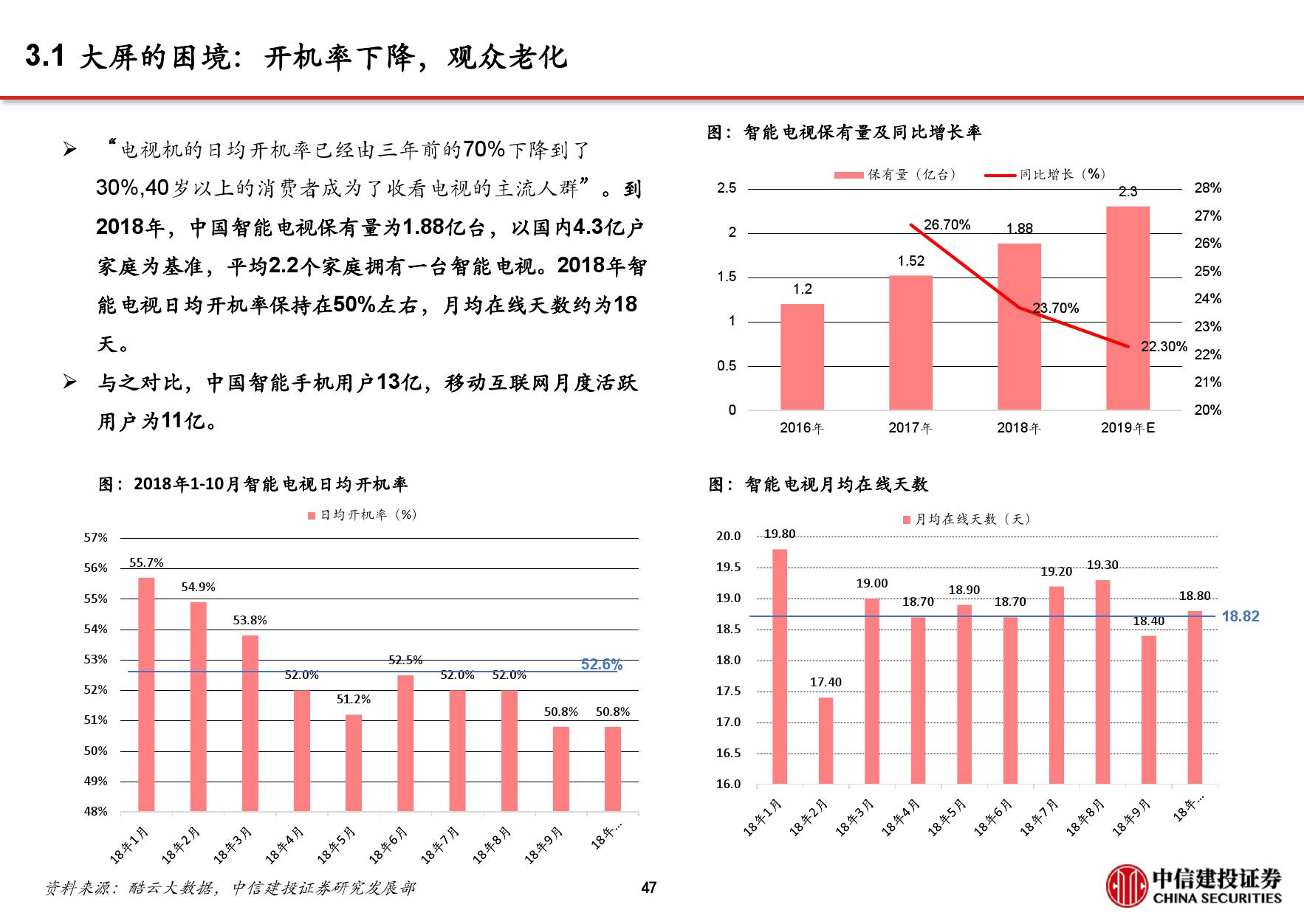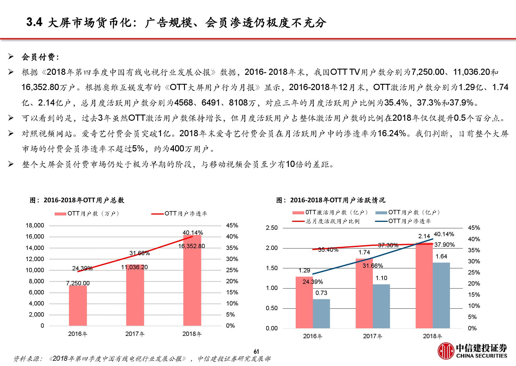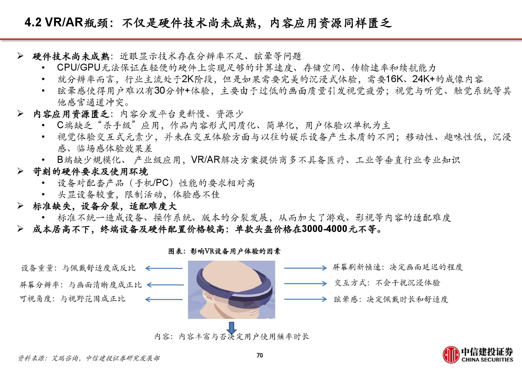 移动通信技术发展推动应用端内容生产和消费形式持续更新,5G有望催生更丰富的娱乐消费。1G是一种仅限语音的蜂窝电话标准,使用范围小,风险性大且传输速度慢;2G实现了无线数字通信,包括客户化应用移动网络增强逻辑,同时话音质量也得到了很大改进,但依然无法支持视频、图画;3G相对于第二代移动通信传输速度有了很大提升,最快的速度可以达到500kbps,流速的提升为图像、音乐、视频流等多种媒体形式的实现提供了可能,同时多媒体业务处理也使得流量体量暴发式增长到2G时代的8倍以上;4G网络在3G基础上对WLAN进行了融合,可以传输与电脑图像质量相当的视频,能够以100Mbps的速度进行下载,比家用的4M宽带快25倍,流量体量由于应用端高流量消耗的功能开启,较3G时增长近100余倍,短视频、移动视频直播应运而生;5G时代更高的流速以及更大的流量将催生更高质量的超高清视频以及更低延时的云VR/AR。