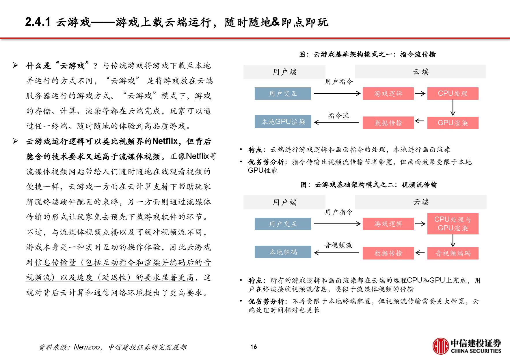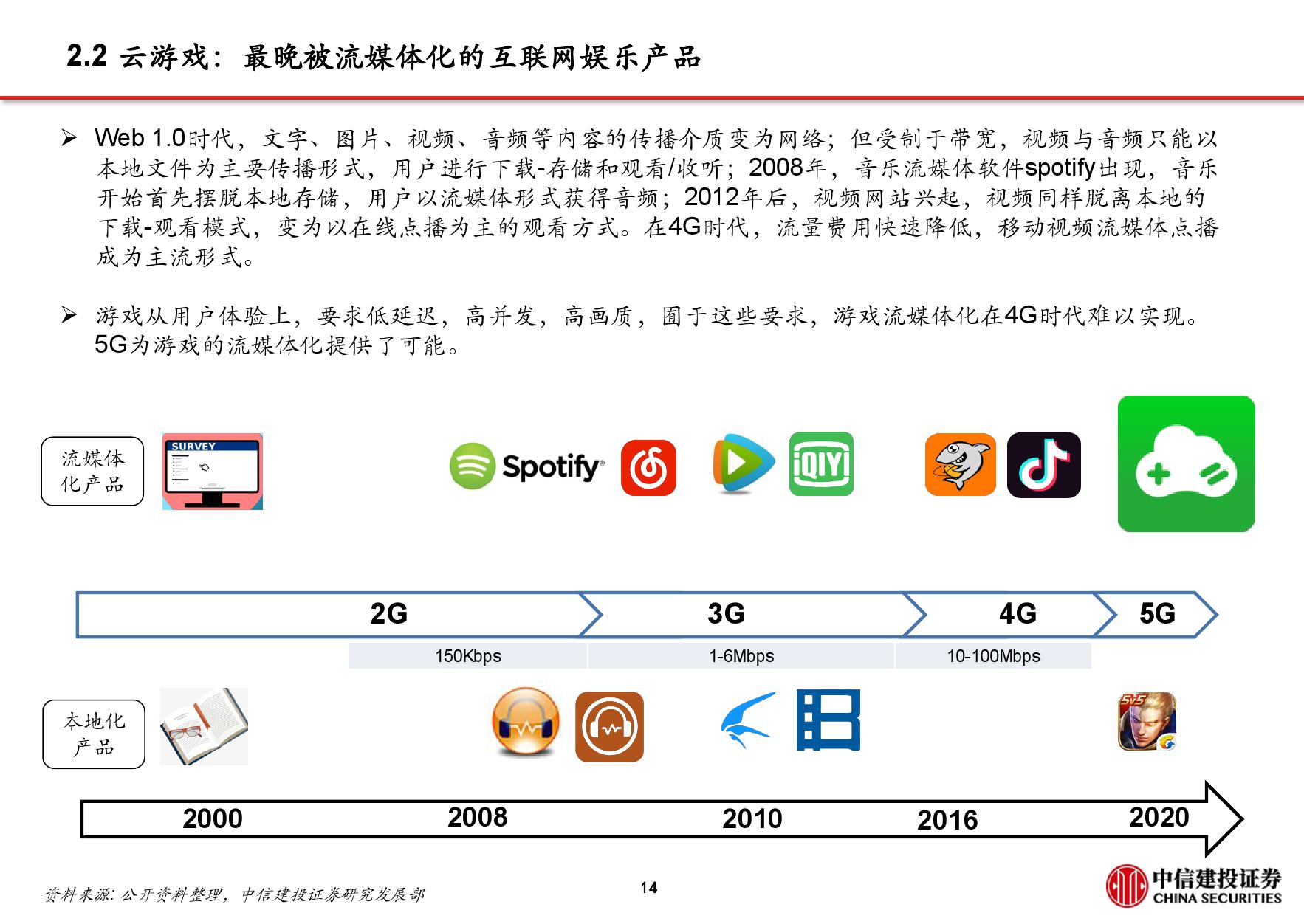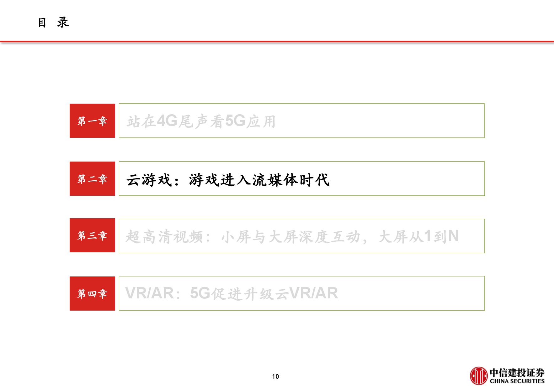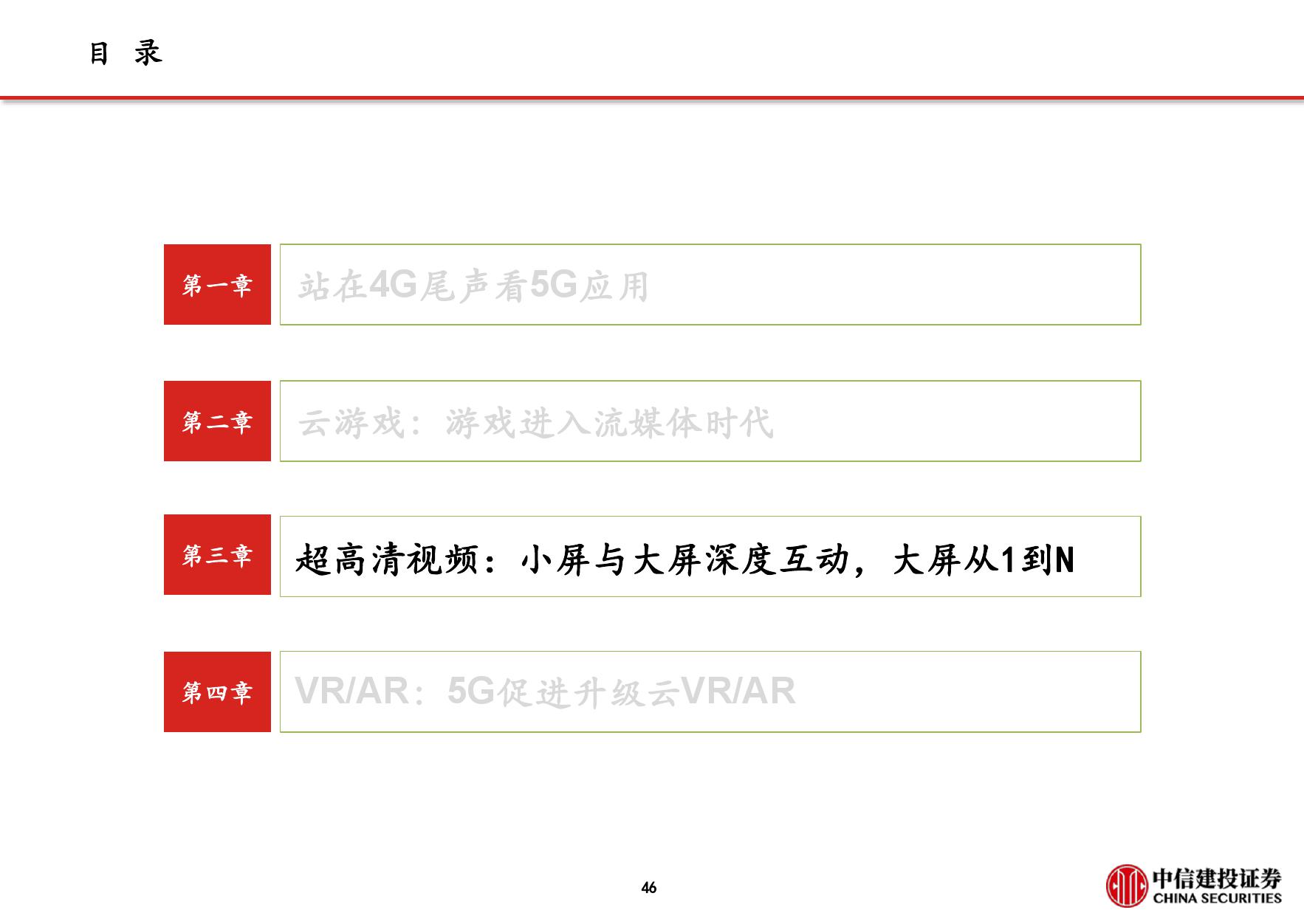3)5G使得高清视频、云游戏成为可能。视频清晰度受制于在线流速和数据连接的稳定性,高清视频对带宽和流速更强。同样的,云游戏对游戏终端的要求较低,其处理大多依赖于云端进行,对用户互动的实时处理提出了更高的要求。5G所拥有的高带宽、强连接、大容量特点,可提供质量更好的视频流,满足高清电视和云游戏在高峰时期的可靠连接,确保高品质的游戏体验。