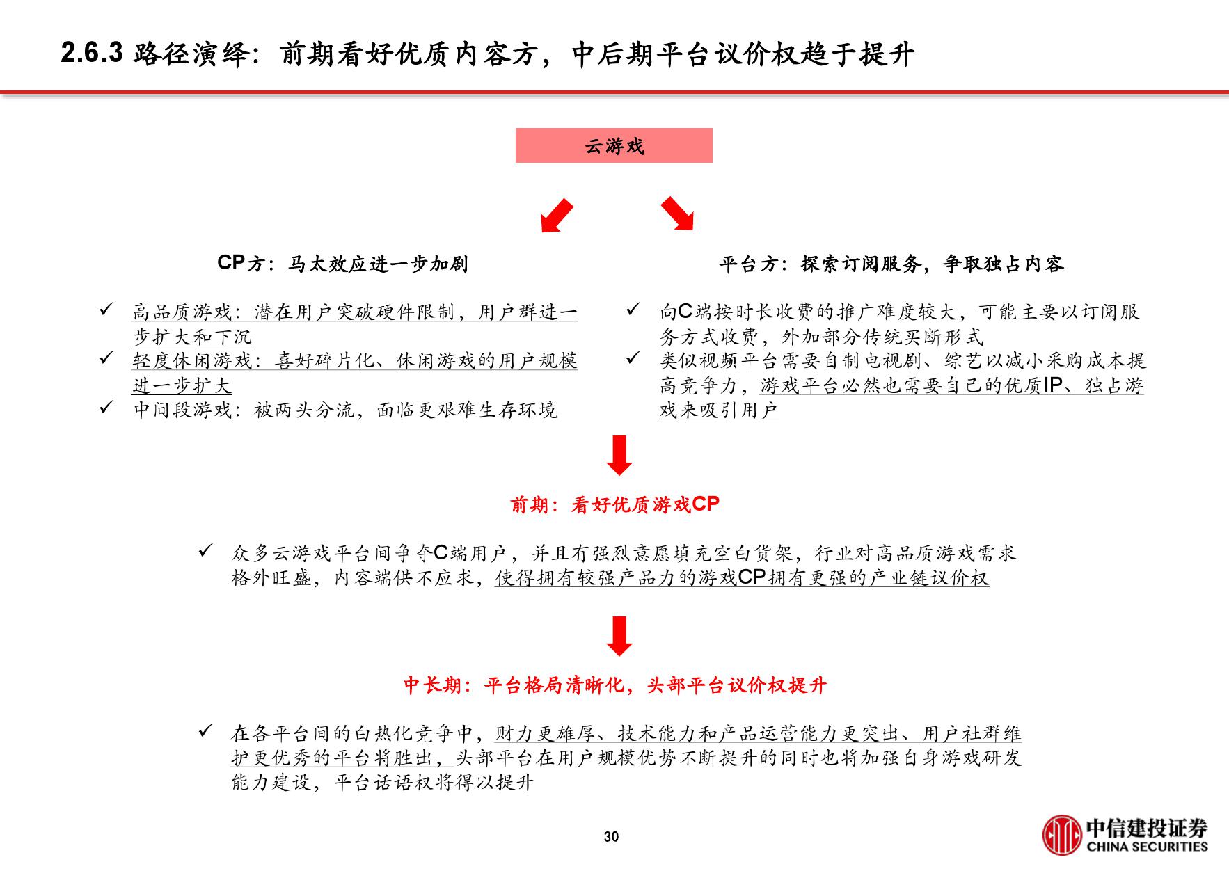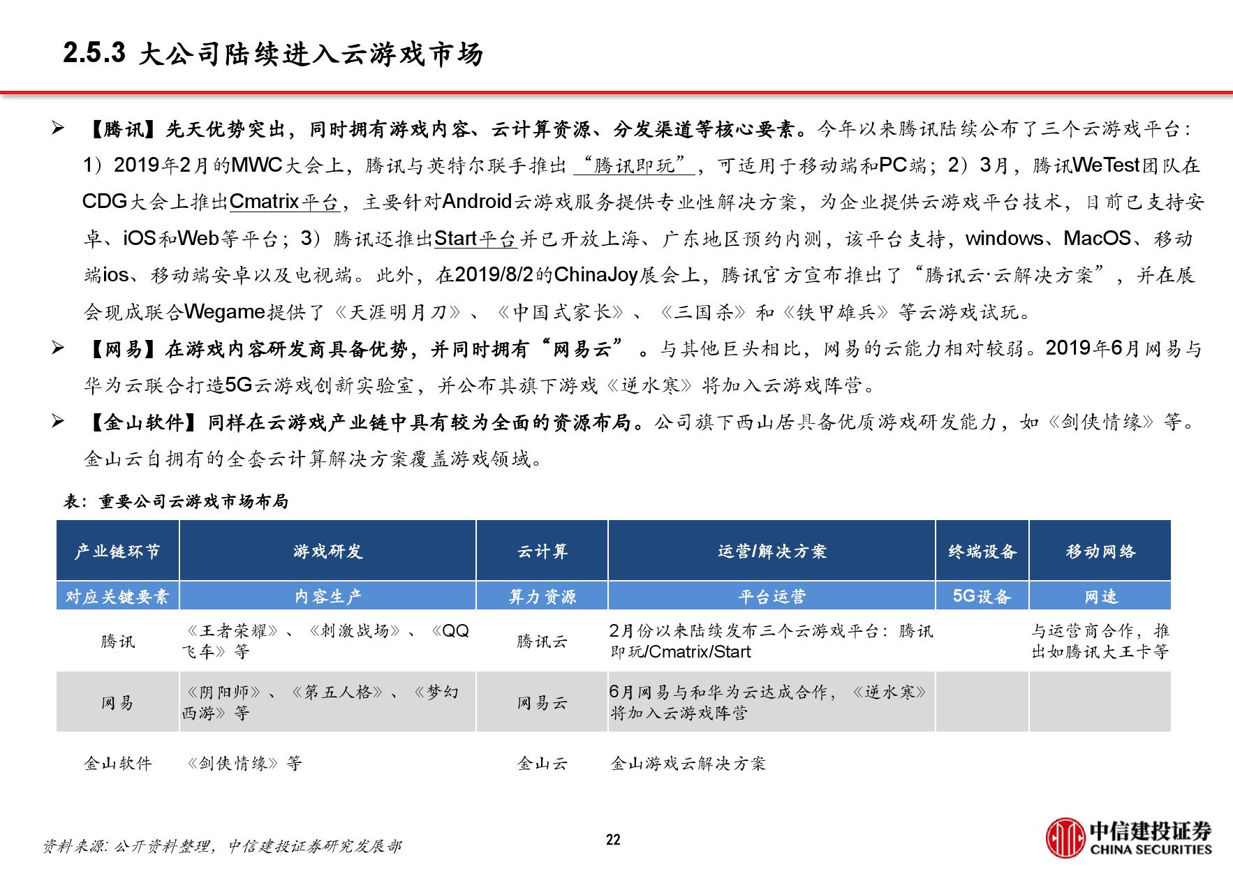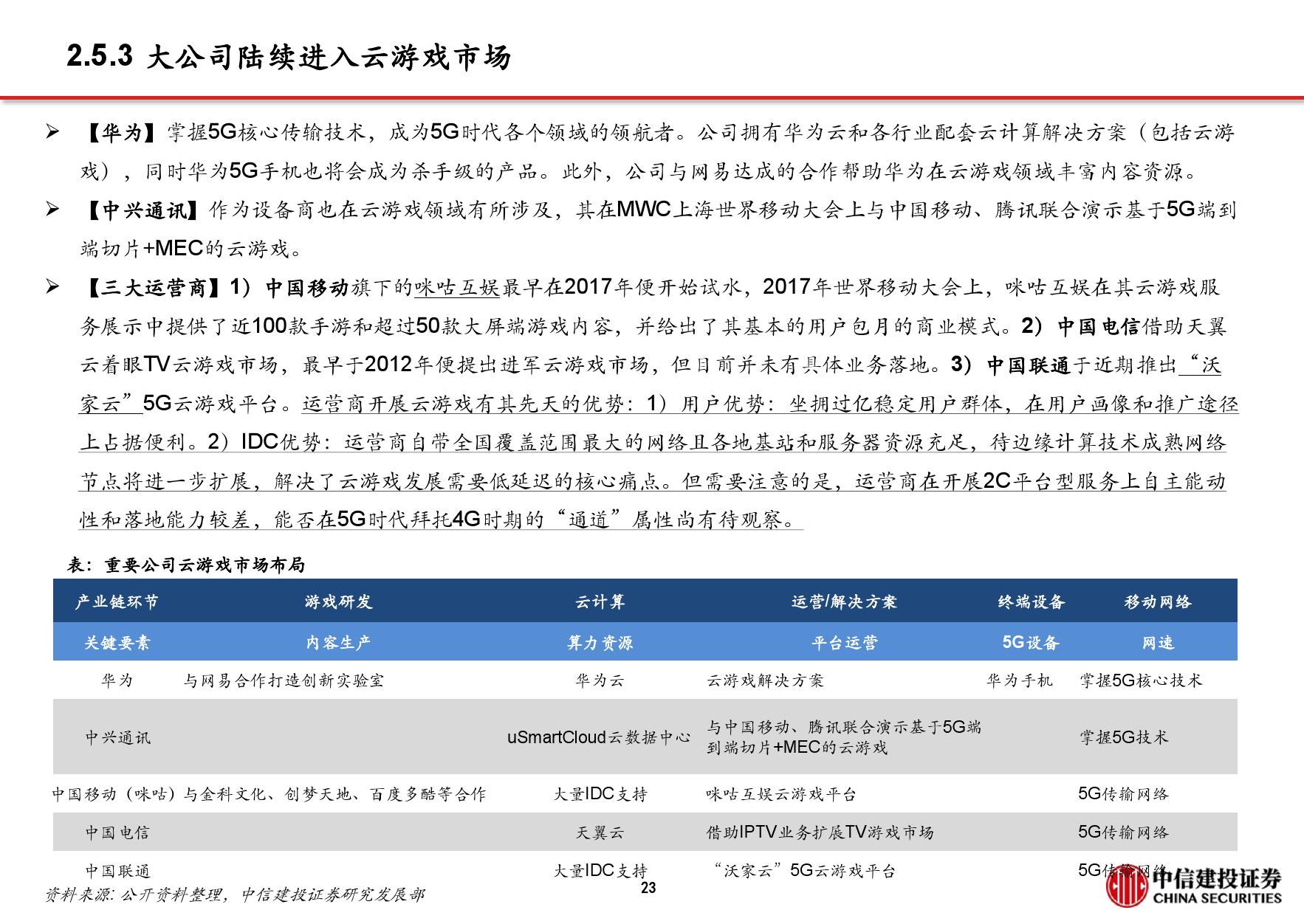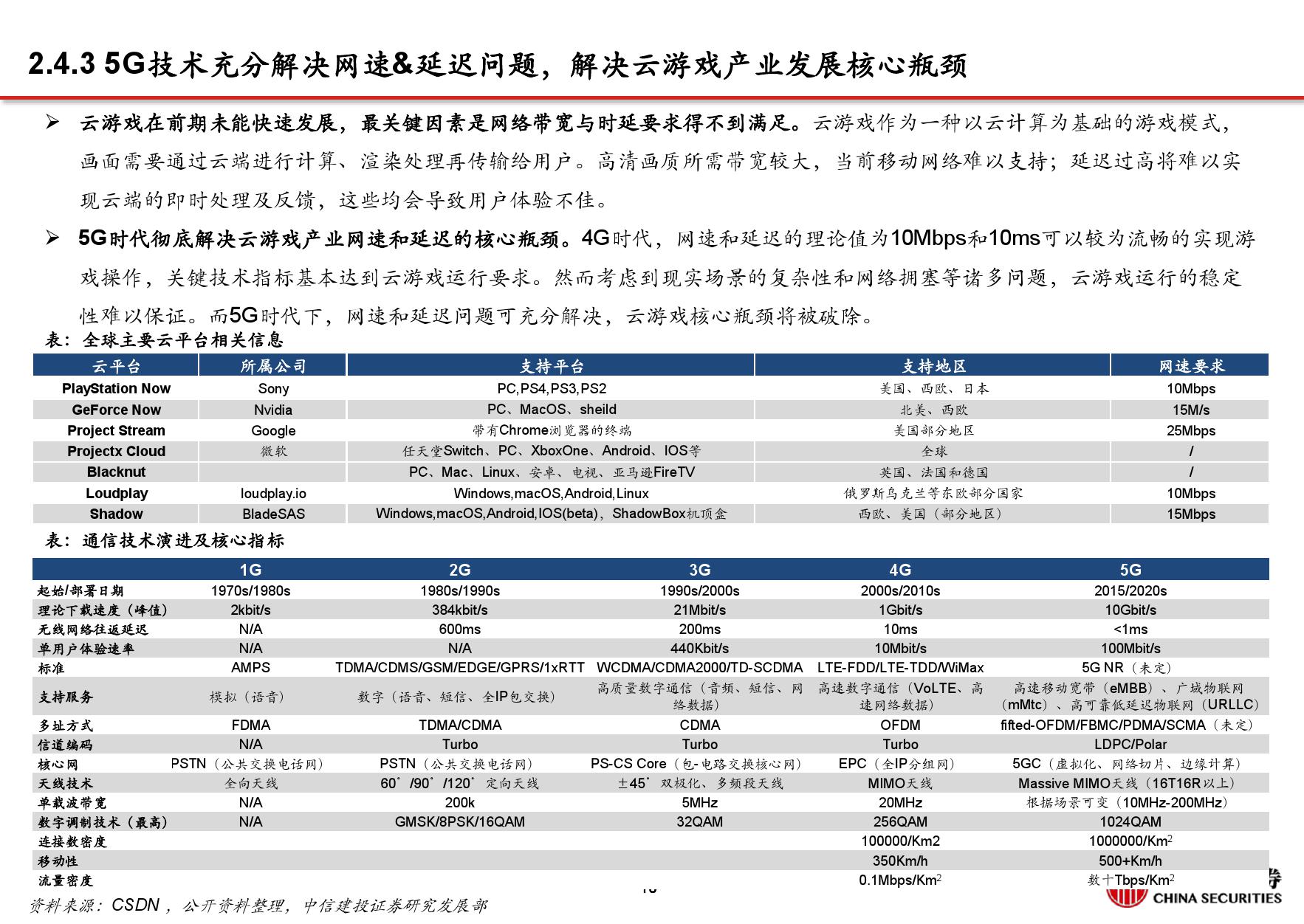 3)5G使得高清视频、云游戏成为可能。视频清晰度受制于在线流速和数据连接的稳定性,高清视频对带宽和流速更强。同样的,云游戏对游戏终端的要求较低,其处理大多依赖于云端进行,对用户互动的实时处理提出了更高的要求。5G所拥有的高带宽、强连接、大容量特点,可提供质量更好的视频流,满足高清电视和云游戏在高峰时期的可靠连接,确保高品质的游戏体验。