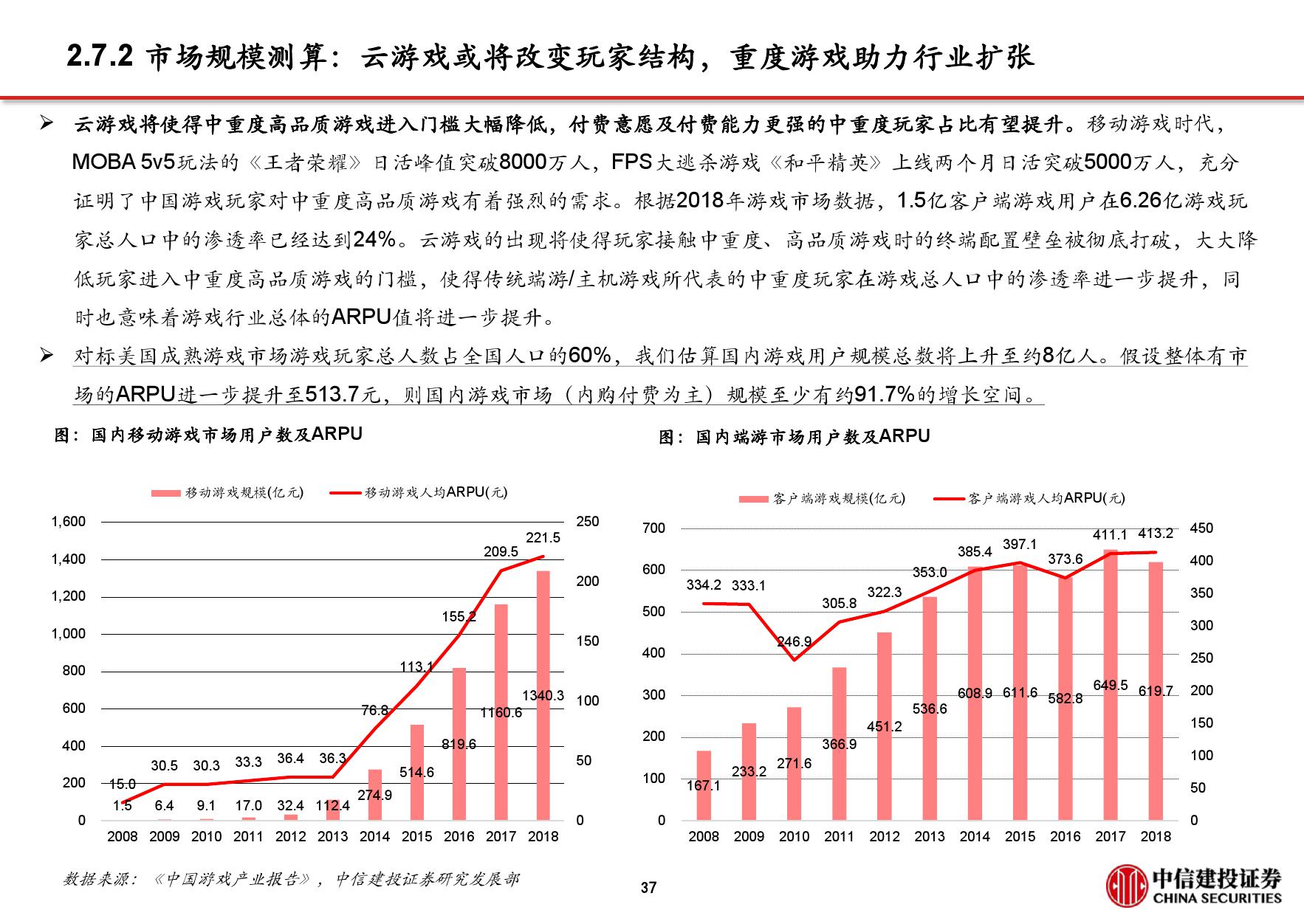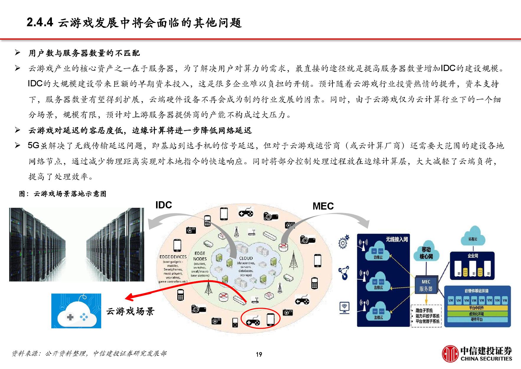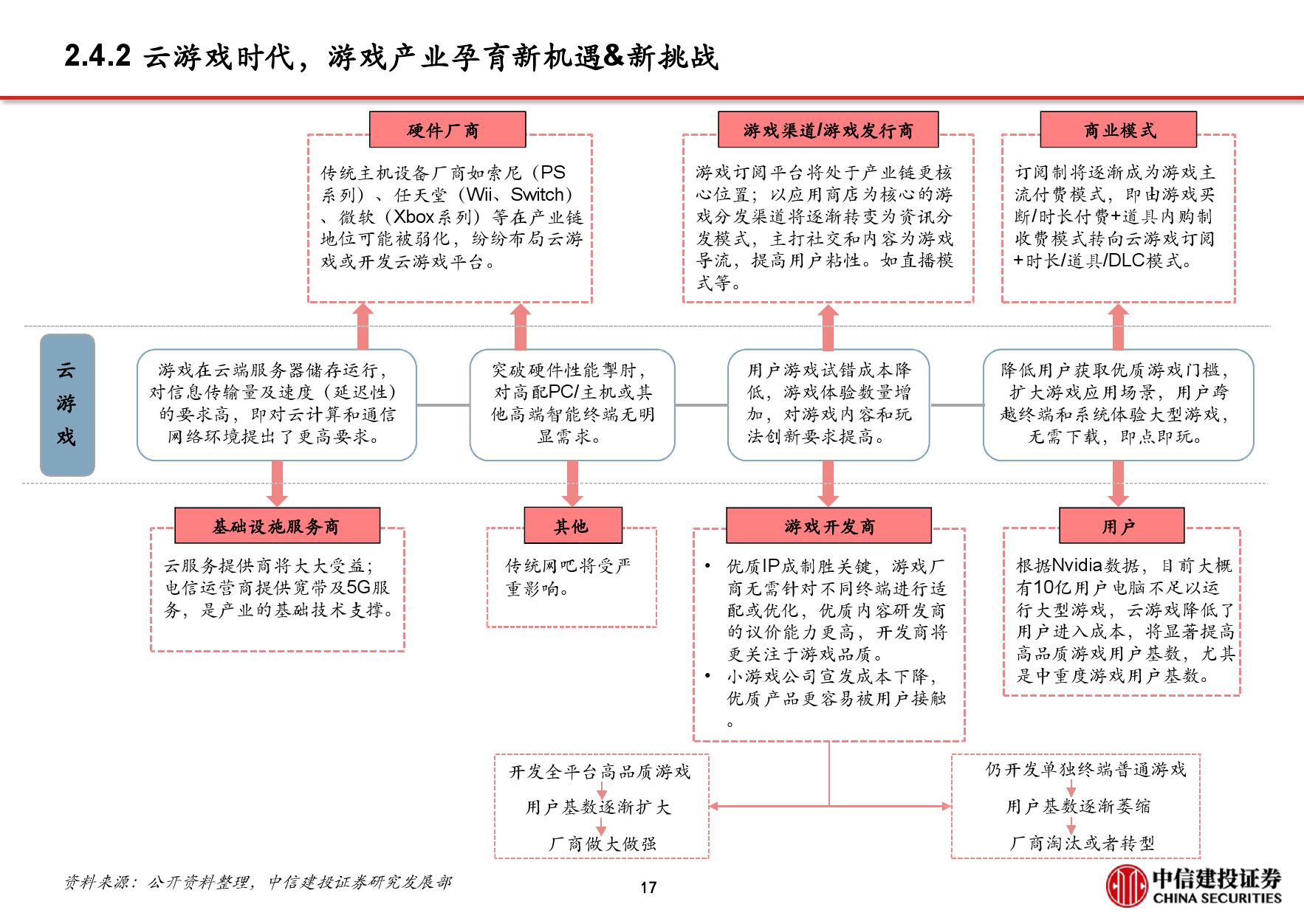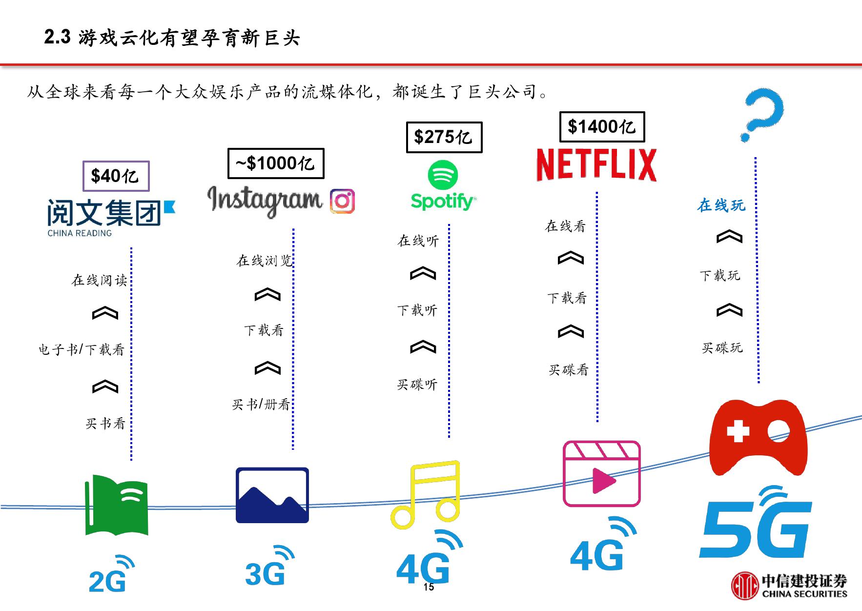 早期任天堂的红白机到索尼的PS机,游戏设备的革新周期与新游戏发布的周期基本吻合;而创新游戏产品的发布也往往引领游戏市场的新一轮热潮。2007年,iPhone智能手机触摸屏技术的出现,提供了更具便利性和易用性的游戏条件,从未考虑购买游戏机的消费者可以通过智能手机进行游戏,智能手机游戏市场的开启解决了主机游戏的痛点,最大程度挖掘了潜在的用户群体。可以预见的,5G加持下基于云计算技术的云游戏可在智能手机游戏的基础上解决其存在的高耗能、移动处理器功能限制等痛点,或成为游戏市场新风口,为产业带来新一轮发展机遇。同样,VR/AR基于5G+云的新土壤上将更具发展动力,其革命性的娱乐体验方式或将直接带动人们娱乐生活方式的彻底变革。