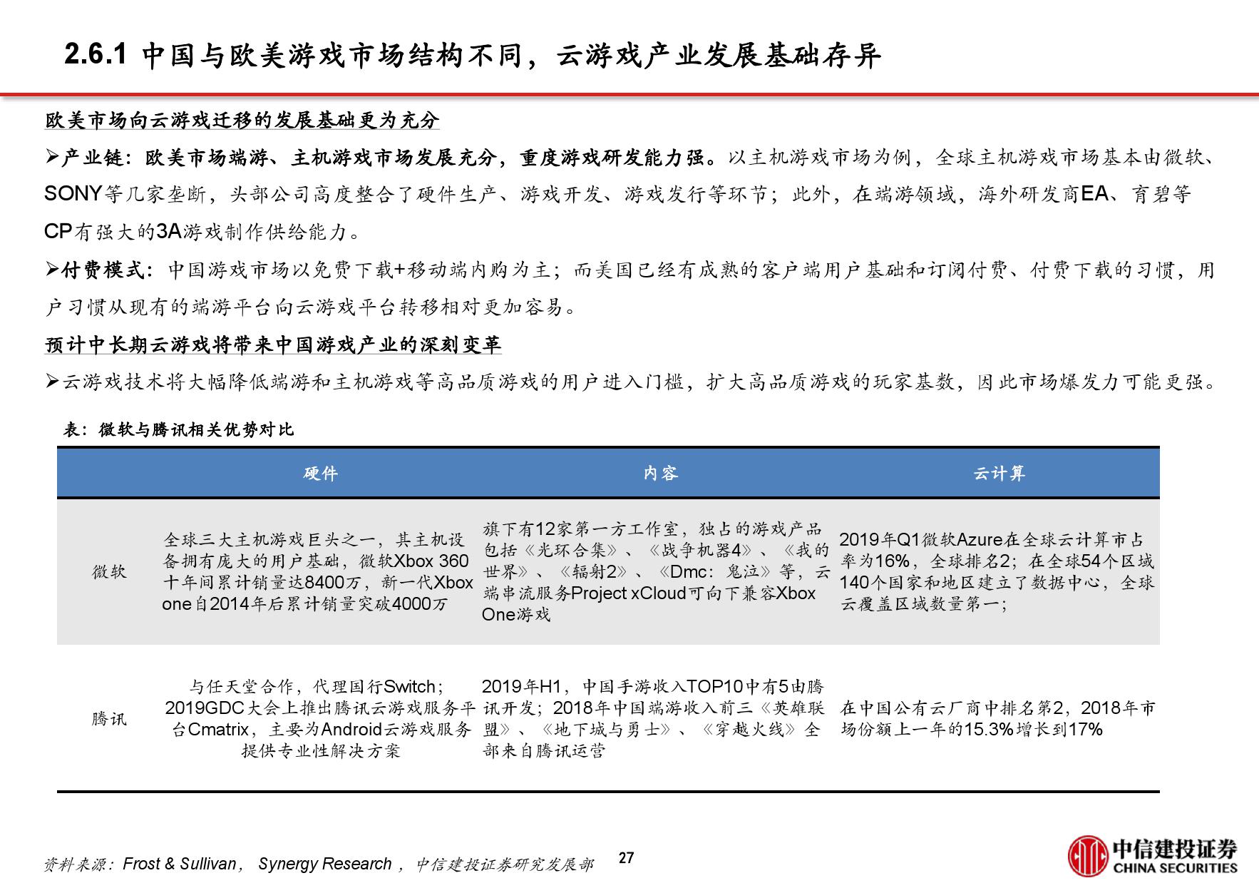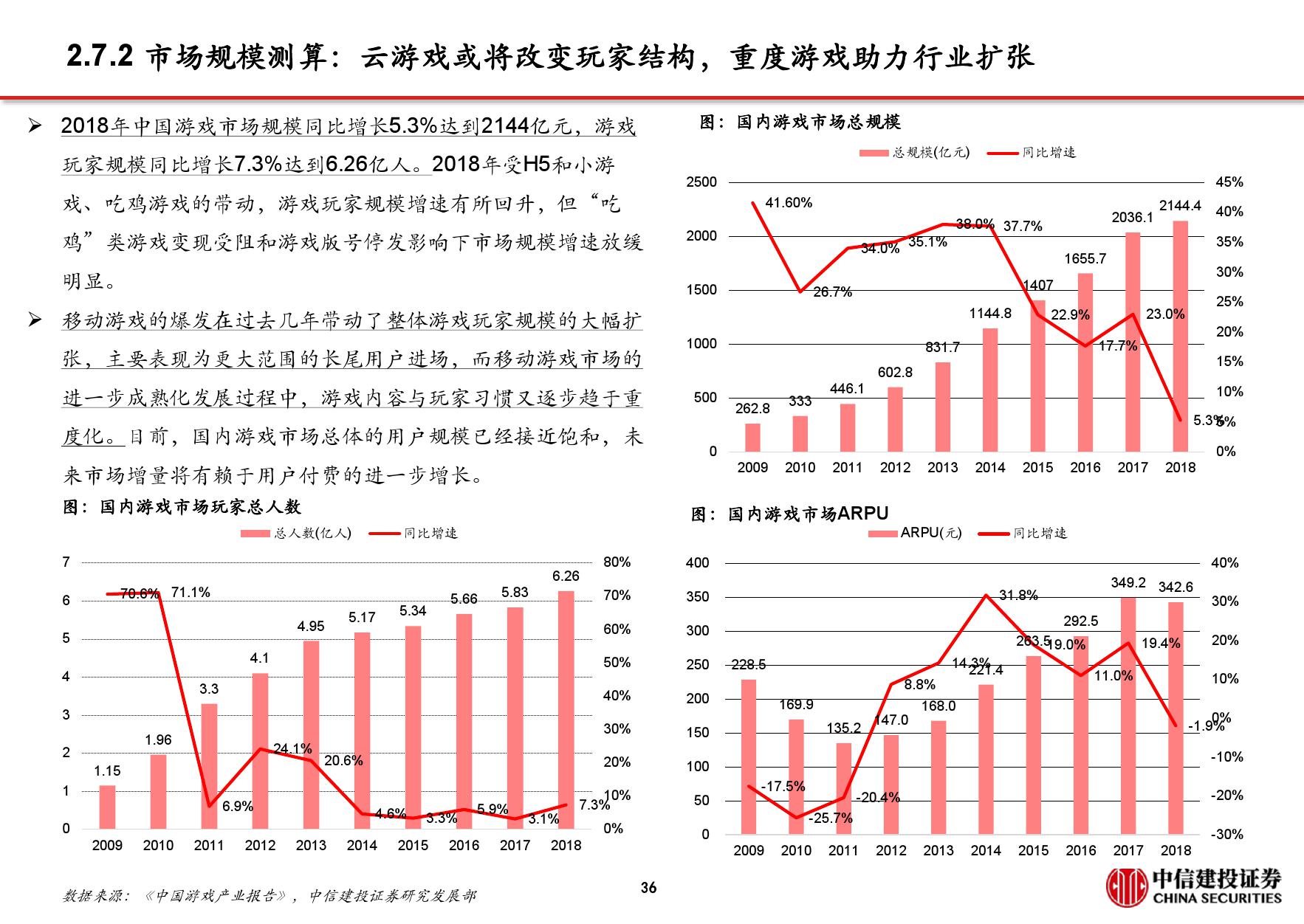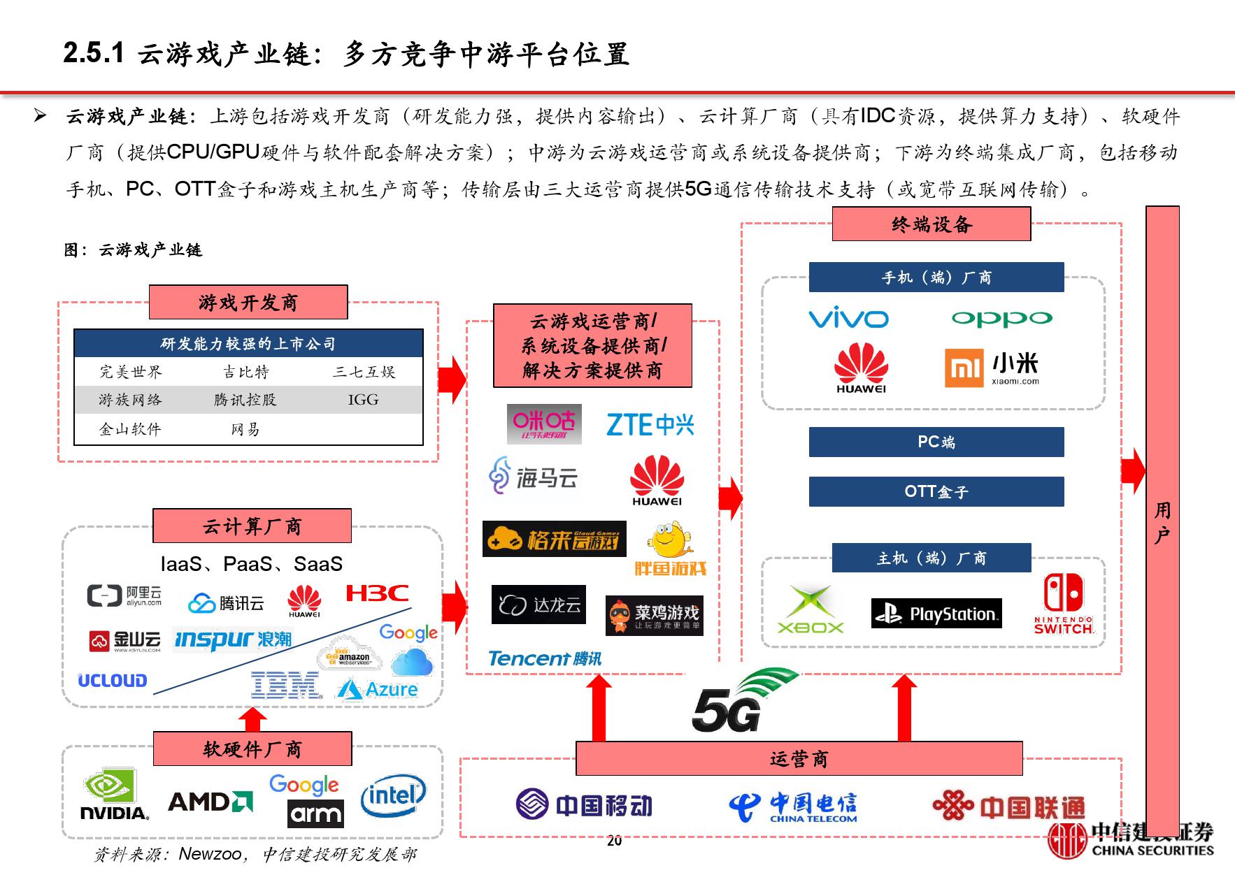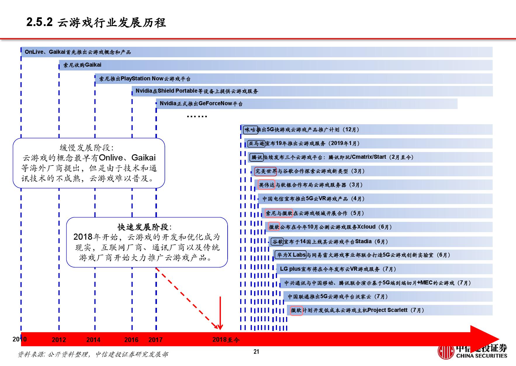 早期任天堂的红白机到索尼的PS机,游戏设备的革新周期与新游戏发布的周期基本吻合;而创新游戏产品的发布也往往引领游戏市场的新一轮热潮。2007年,iPhone智能手机触摸屏技术的出现,提供了更具便利性和易用性的游戏条件,从未考虑购买游戏机的消费者可以通过智能手机进行游戏,智能手机游戏市场的开启解决了主机游戏的痛点,最大程度挖掘了潜在的用户群体。可以预见的,5G加持下基于云计算技术的云游戏可在智能手机游戏的基础上解决其存在的高耗能、移动处理器功能限制等痛点,或成为游戏市场新风口,为产业带来新一轮发展机遇。同样,VR/AR基于5G+云的新土壤上将更具发展动力,其革命性的娱乐体验方式或将直接带动人们娱乐生活方式的彻底变革。