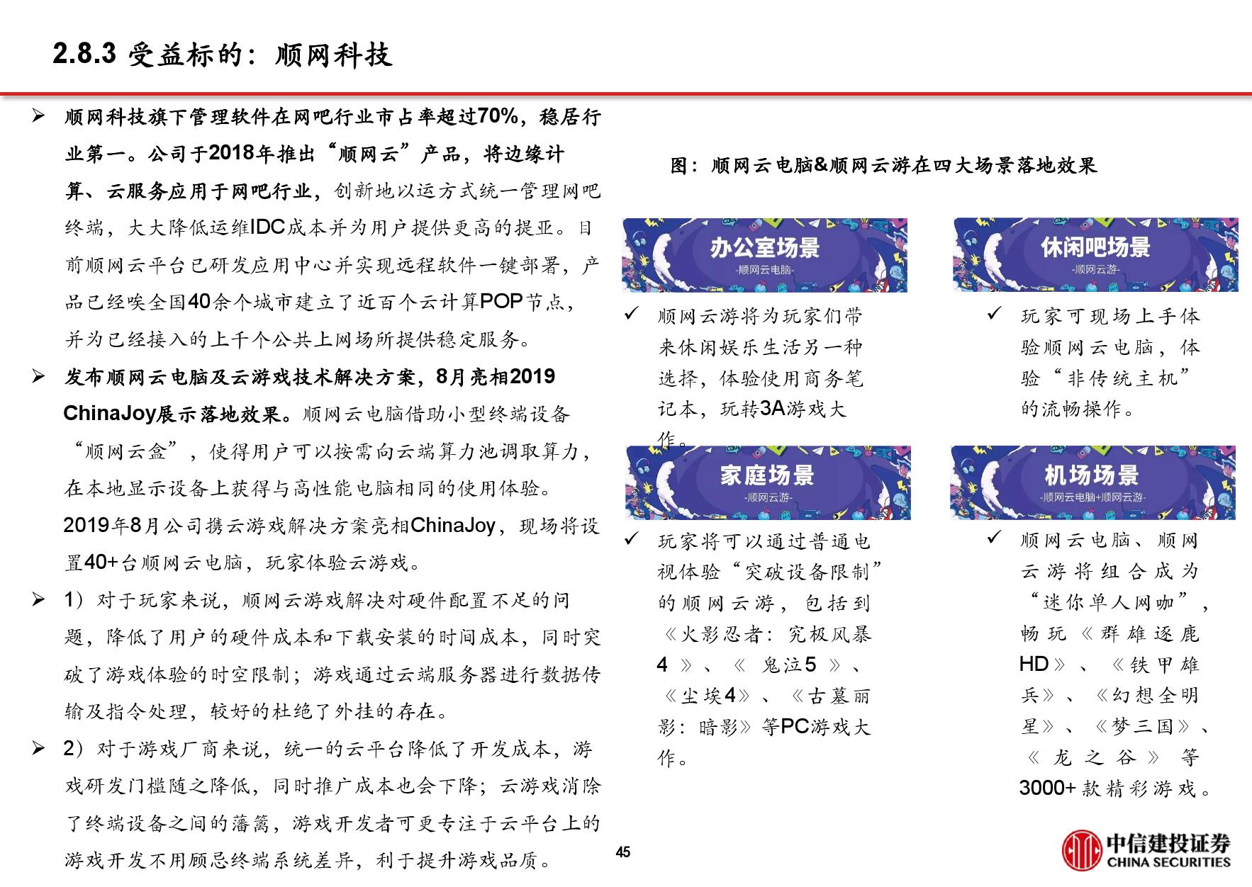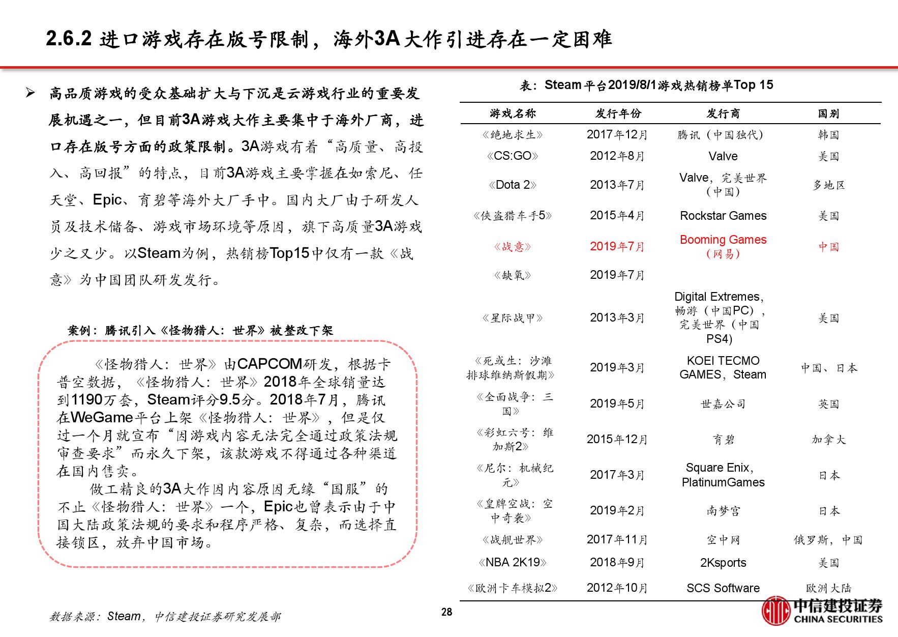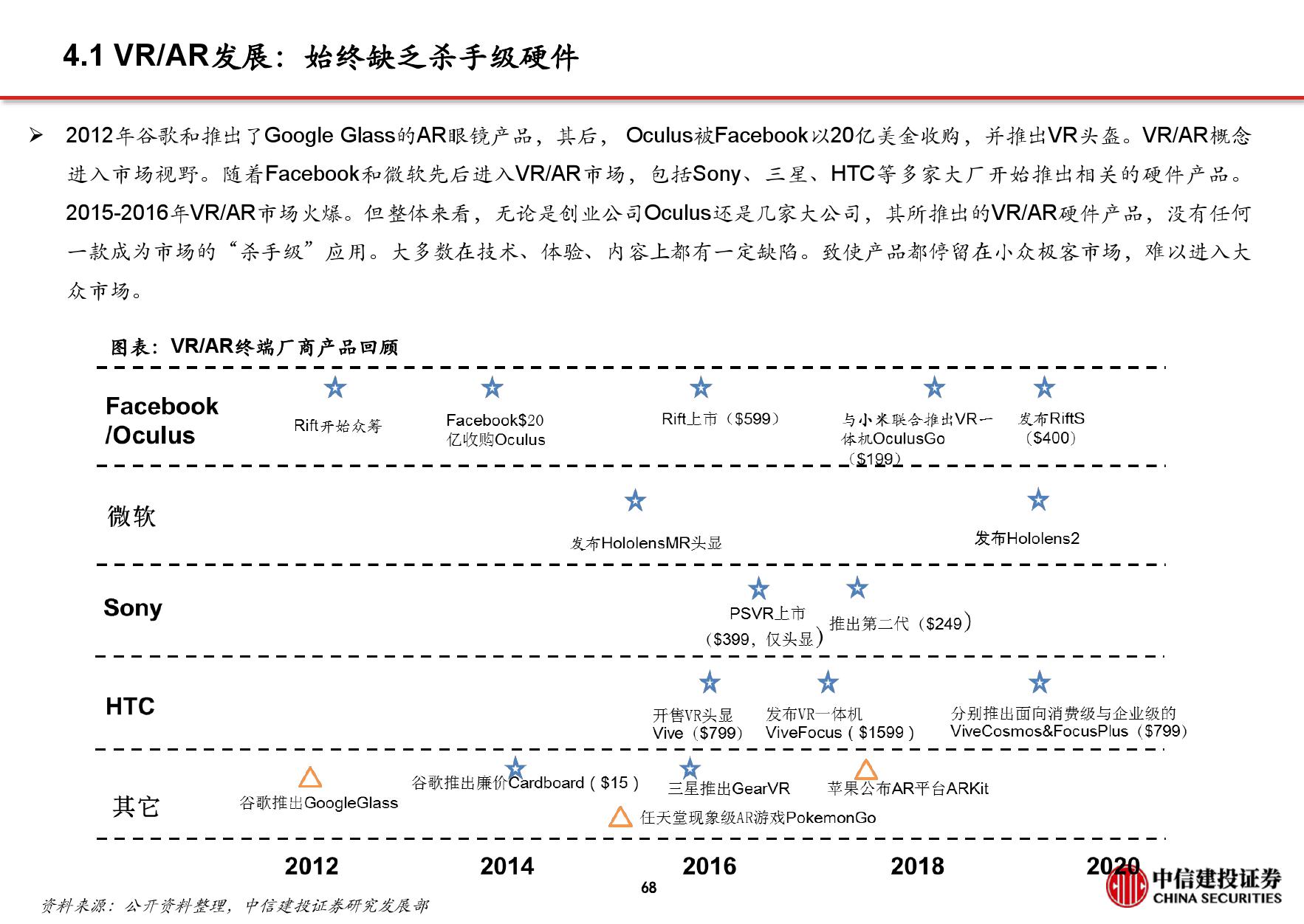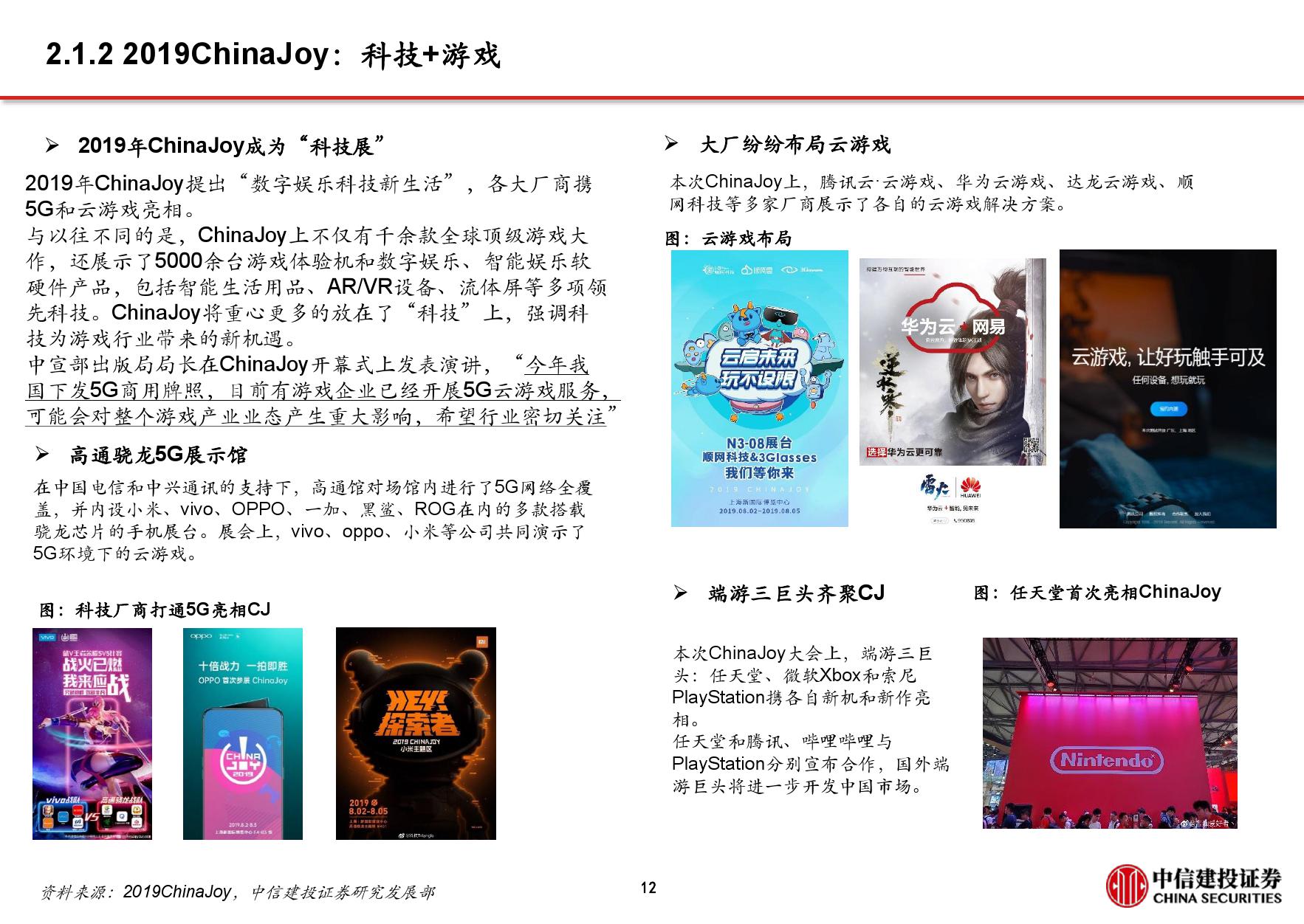 早期任天堂的红白机到索尼的PS机,游戏设备的革新周期与新游戏发布的周期基本吻合;而创新游戏产品的发布也往往引领游戏市场的新一轮热潮。2007年,iPhone智能手机触摸屏技术的出现,提供了更具便利性和易用性的游戏条件,从未考虑购买游戏机的消费者可以通过智能手机进行游戏,智能手机游戏市场的开启解决了主机游戏的痛点,最大程度挖掘了潜在的用户群体。可以预见的,5G加持下基于云计算技术的云游戏可在智能手机游戏的基础上解决其存在的高耗能、移动处理器功能限制等痛点,或成为游戏市场新风口,为产业带来新一轮发展机遇。同样,VR/AR基于5G+云的新土壤上将更具发展动力,其革命性的娱乐体验方式或将直接带动人们娱乐生活方式的彻底变革。
