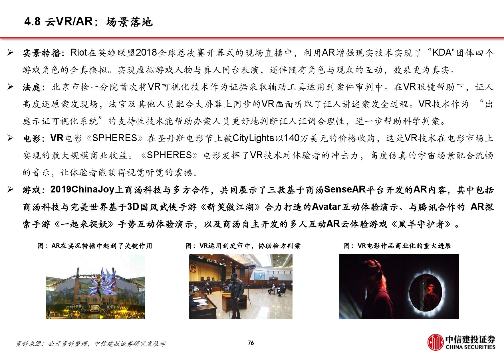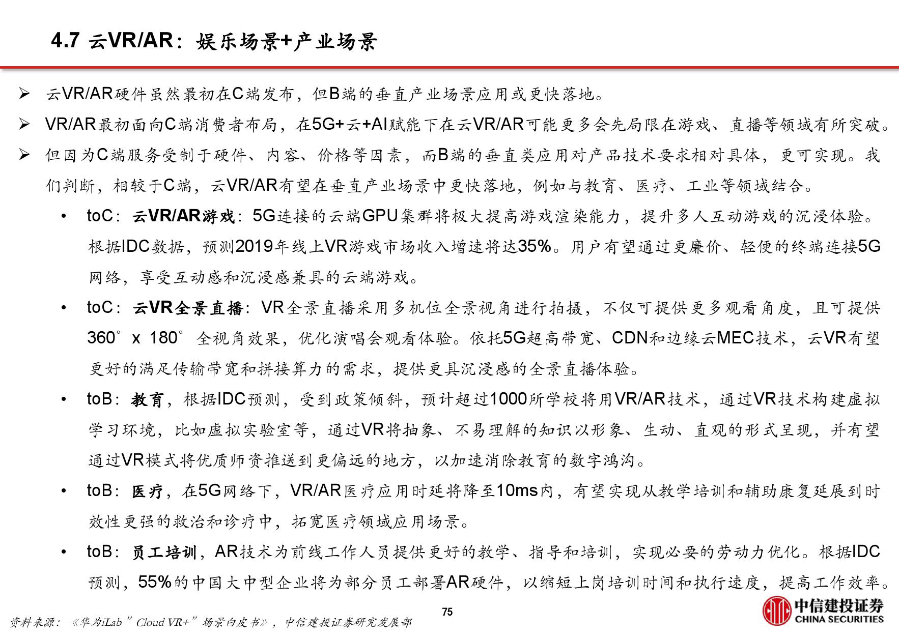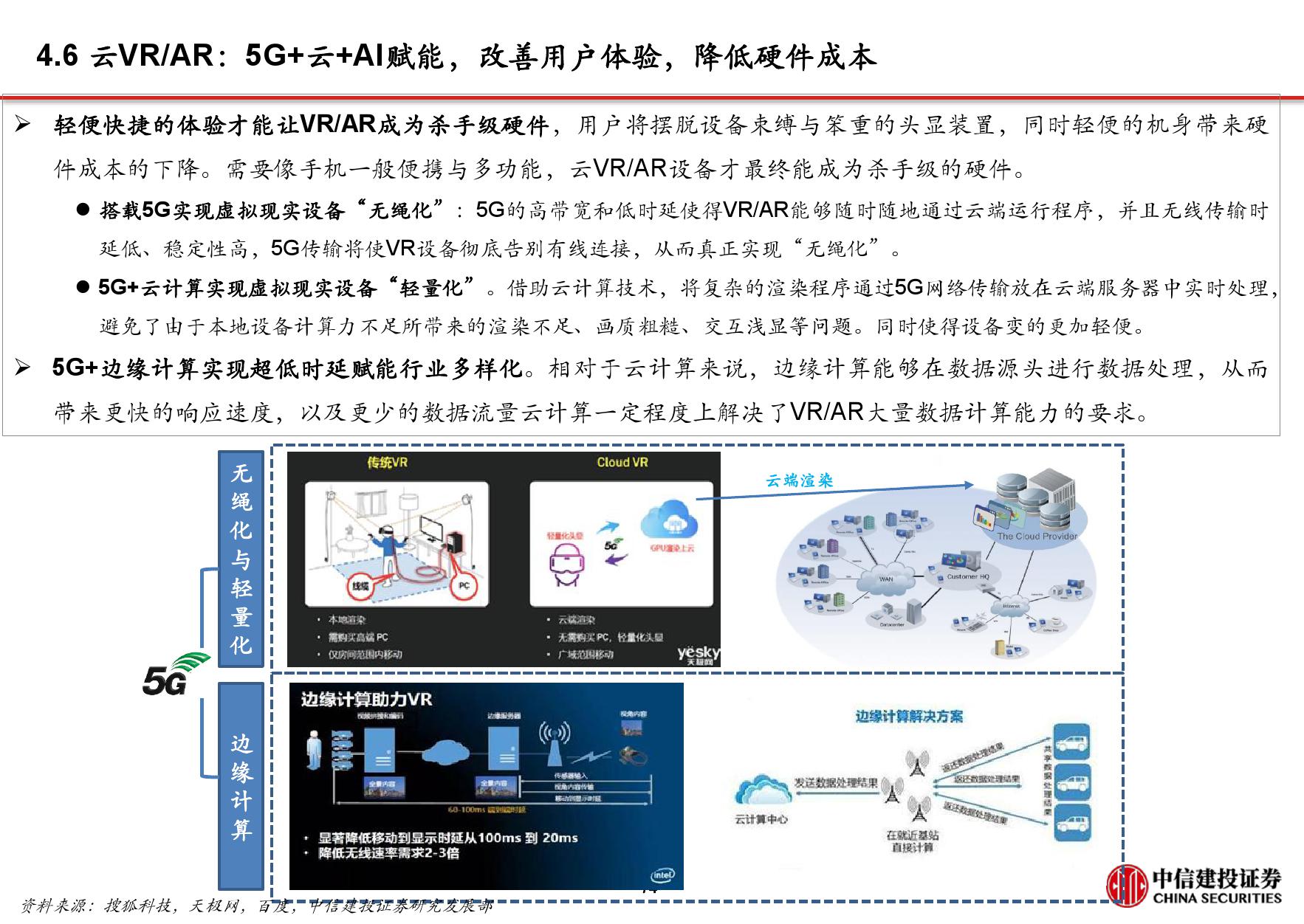 1)5G赋能VR/AR。推进实现设备无绳化,打造“云VR/AR”,“高效率”打通VR/AR的传输方面屏障,“低延时”解决使用中时延带来眩晕感的痛点,提升用户体验,广泛应用于娱乐(如直播、游戏、视频)、教育、医疗、远程施工维保、车载导航等领域。