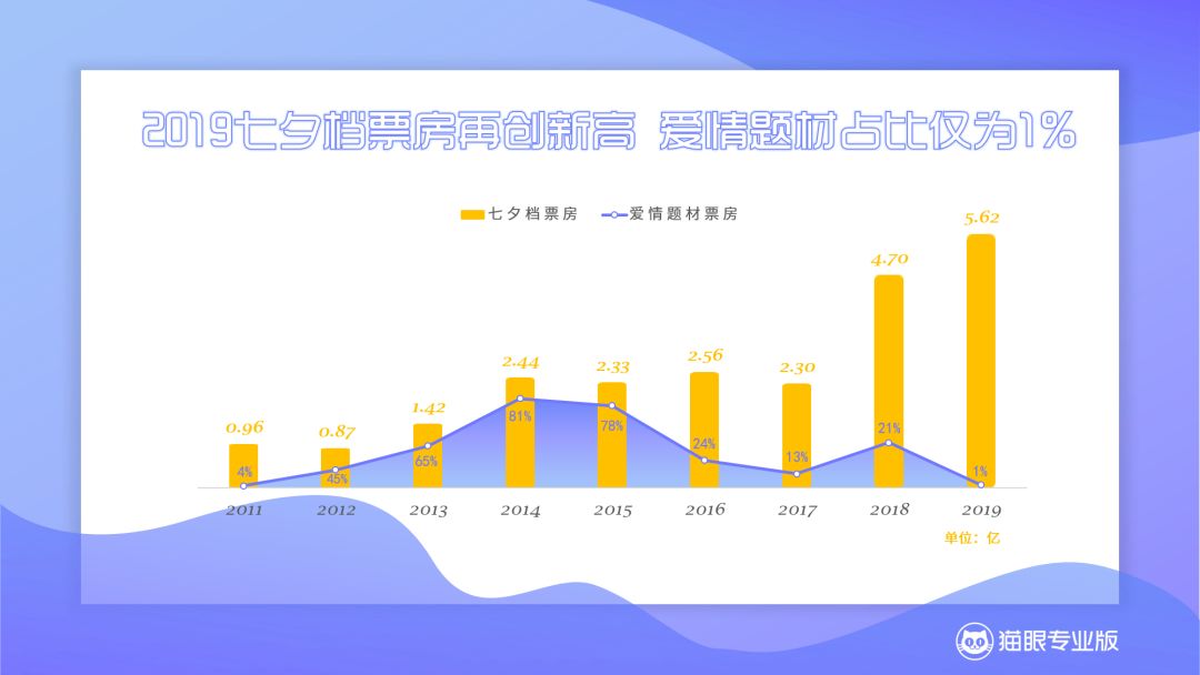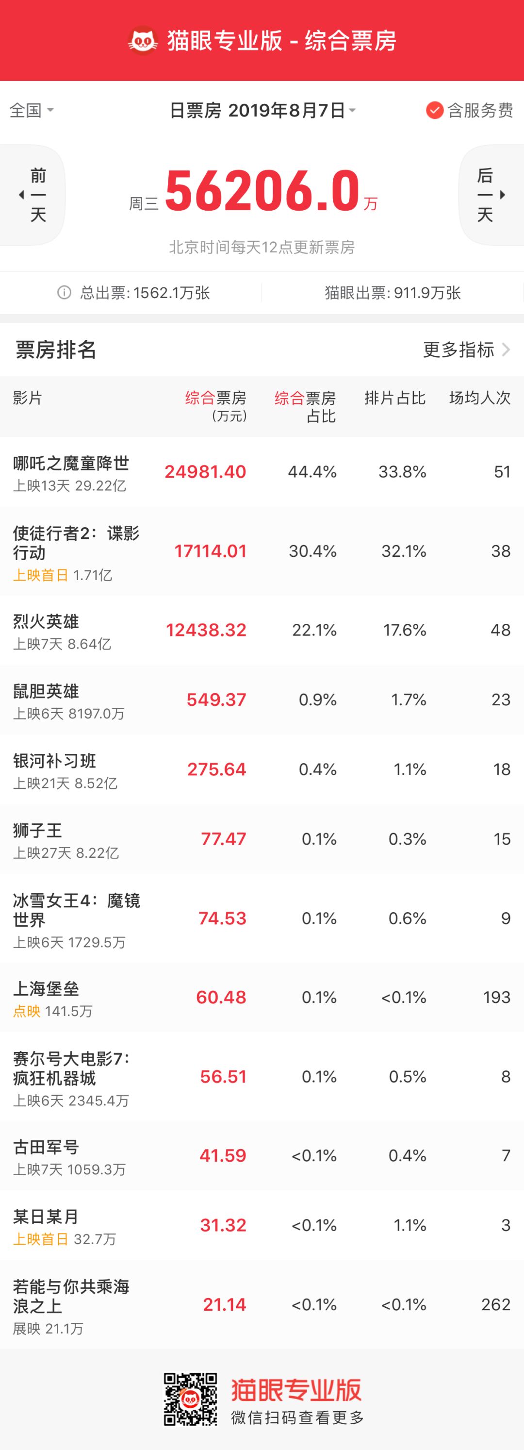 ★8月7日七夕档大盘5.62亿,环比暴涨116.98%,自上周末《哪吒》带动大盘连续两天冲上5亿后,本周三大盘再创暑期档新高,在今年中也仅次于春节档(情人节)以及《复联4》的首周六和五一档首日,相比去年七夕档也实现了0.92亿的增长、再创七夕档历史票房新高。