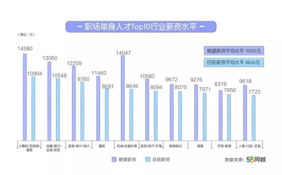 58同城的调研报告还显示,职场单身人才的平均月薪为8836元,其中计算机/互联网/通信和金融/银行/证券行业的平均月薪排名前二,分别为10904元和10548元。随着5G时代的到来,互联网行业的发展又上新台阶,行业的繁荣必然带来人才需求的增大和薪资的提升。金融一直是公认的高薪行业,7月20日,国务院金融稳定发展委员会办公室宣布了一系列金融业进一步对外开放的政策措施。优化金融开放布局,有利于地方高质量发展,也为金融行业从业人员的职业发展带来利好。相比实际薪资,职场单身人才的平均期望月薪为11282元。可见,职场单身人才对薪资有着较高期许,希望通过辛勤奋斗换来更高收入。