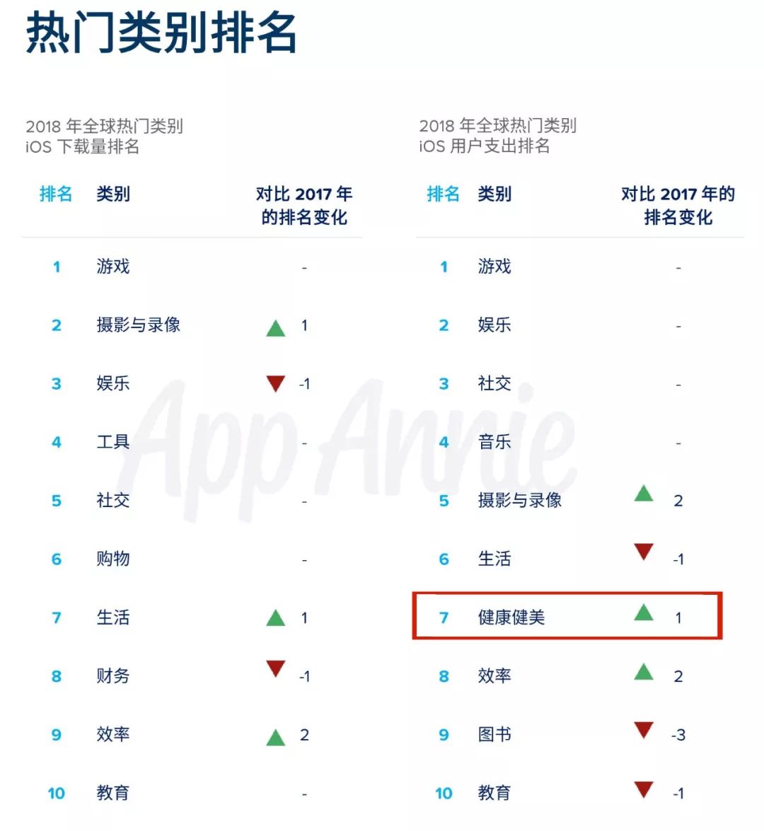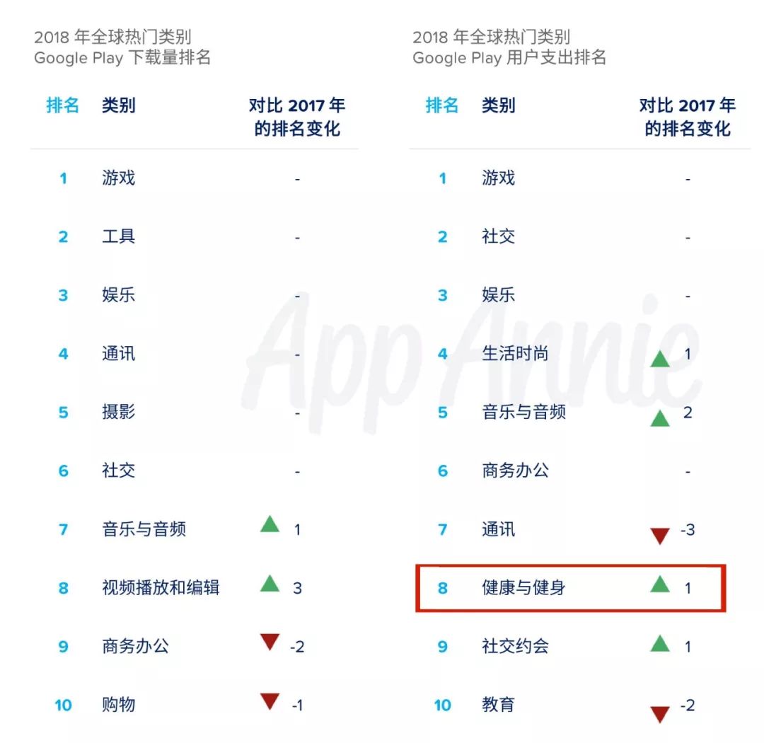 从上图可以看出,无论是iOS端还是安卓端,健康类应用不仅进入了用户支出榜单的前10名,且相比于2017年,排名均有所上升。