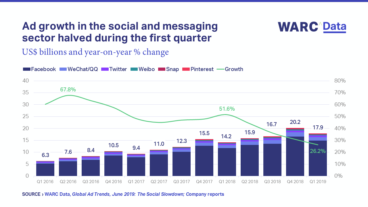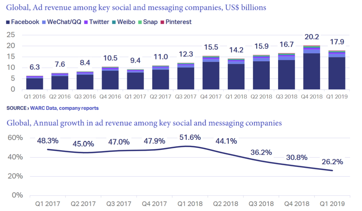 2019年社交媒体广告在继续增长,尽管增速低于前几年。WARC最近的数据显示,2019年第一季度主要社交和即时通讯应用的广告收入同比增长26.2%。
