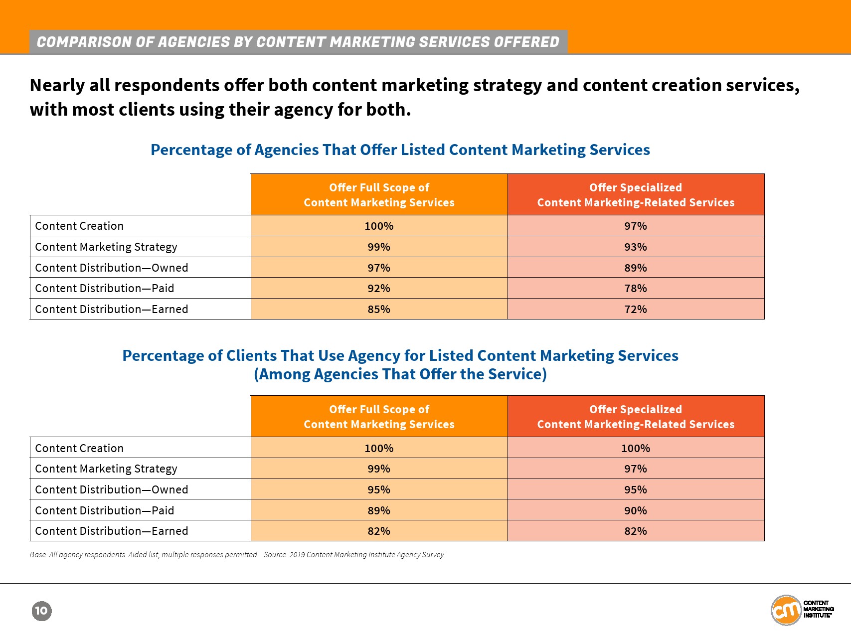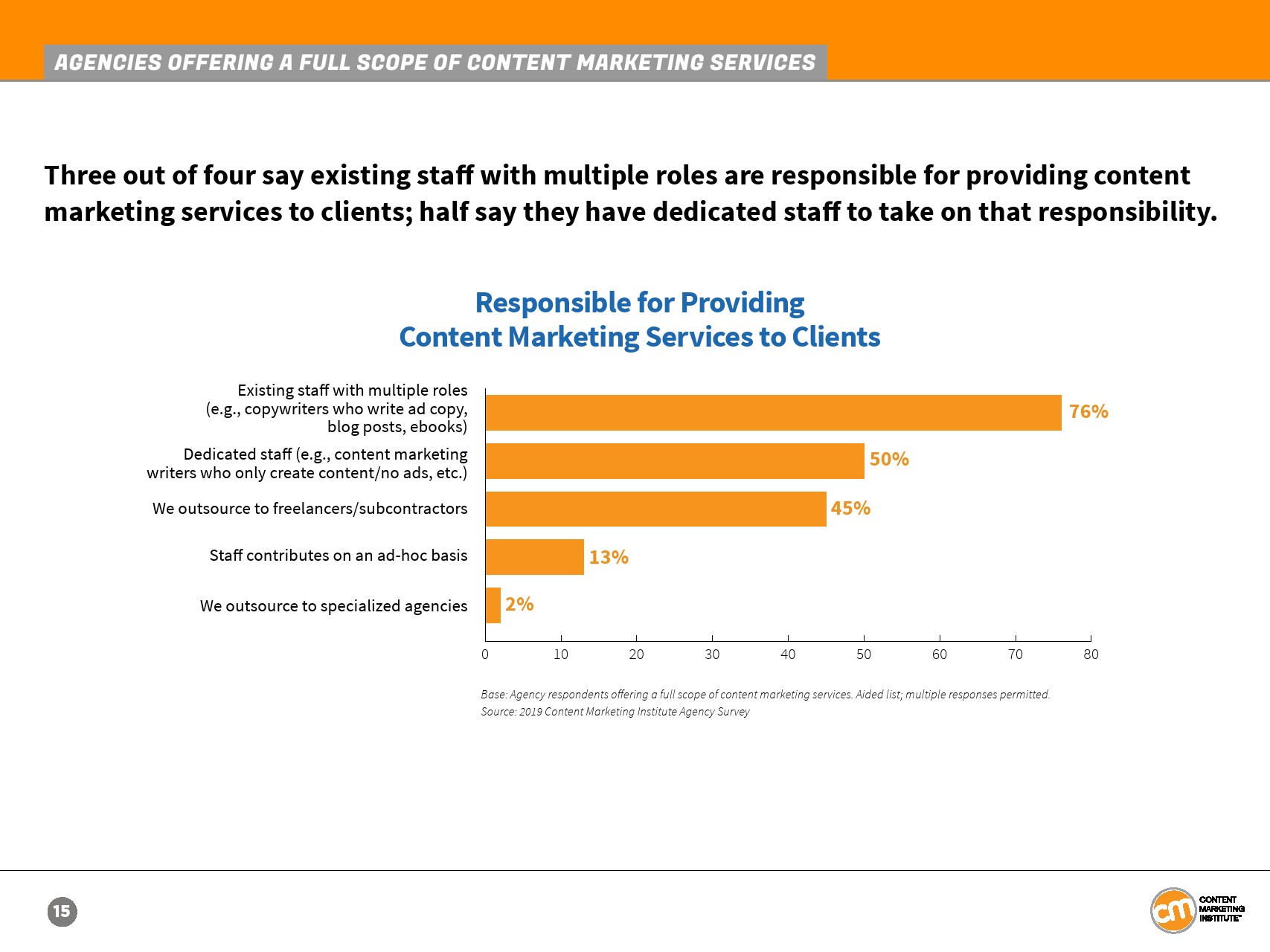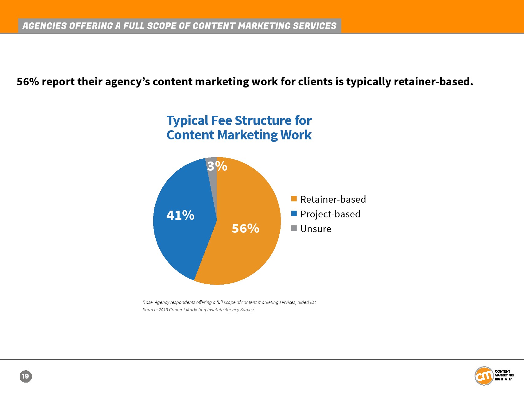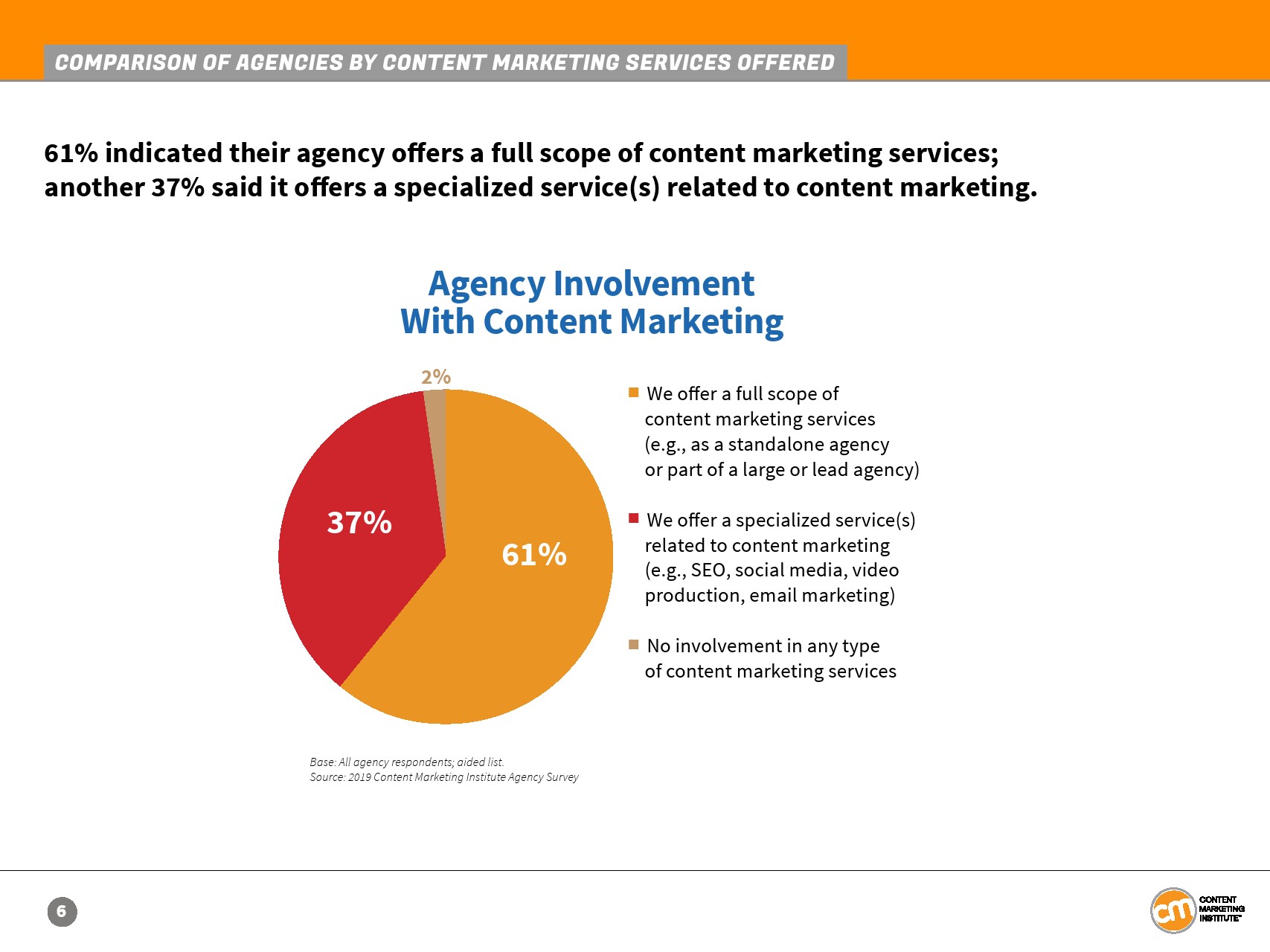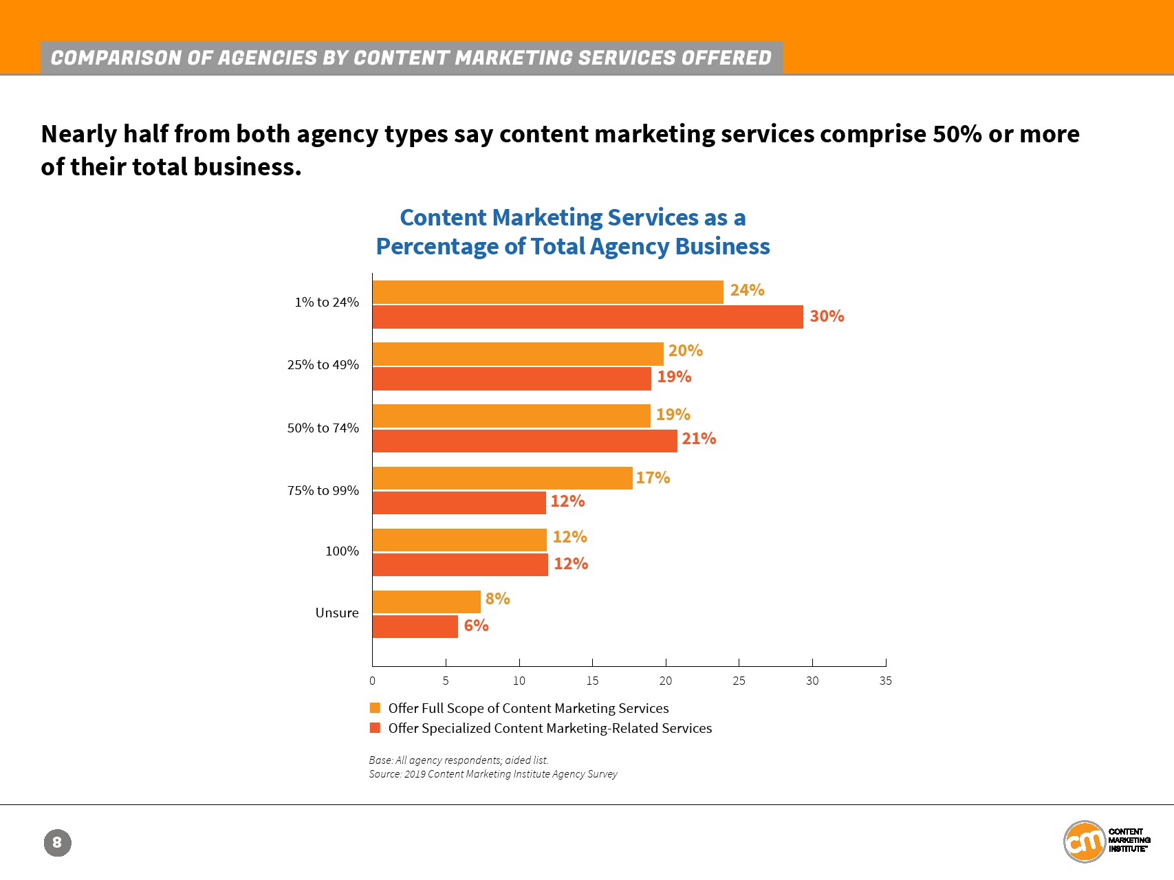内容营销研究所(CMI)发布了新报告“2019年广告代理商调查”。近一半接受调查的代理机构报告称,内容营销服务至少占其总业务的50%。
