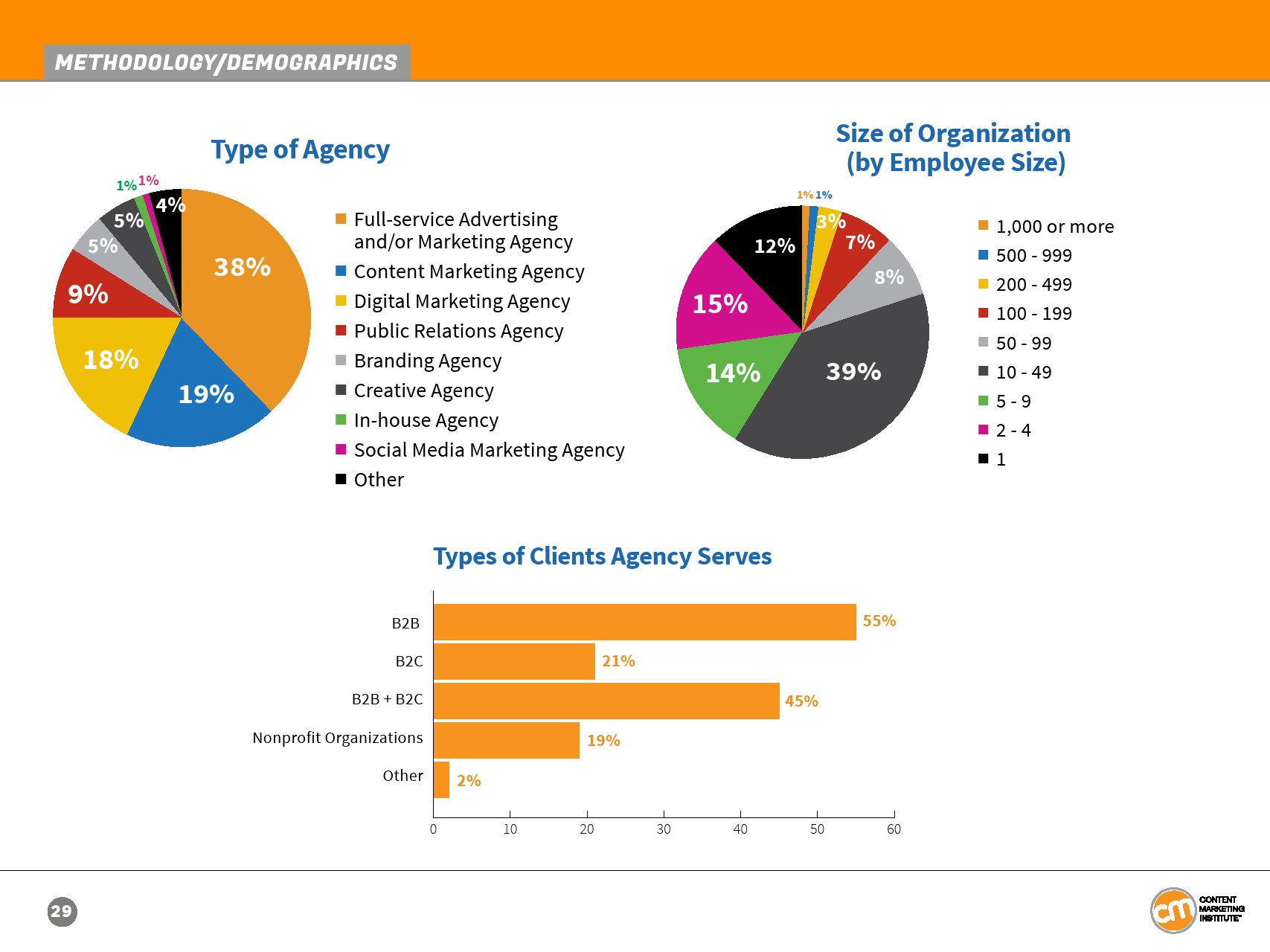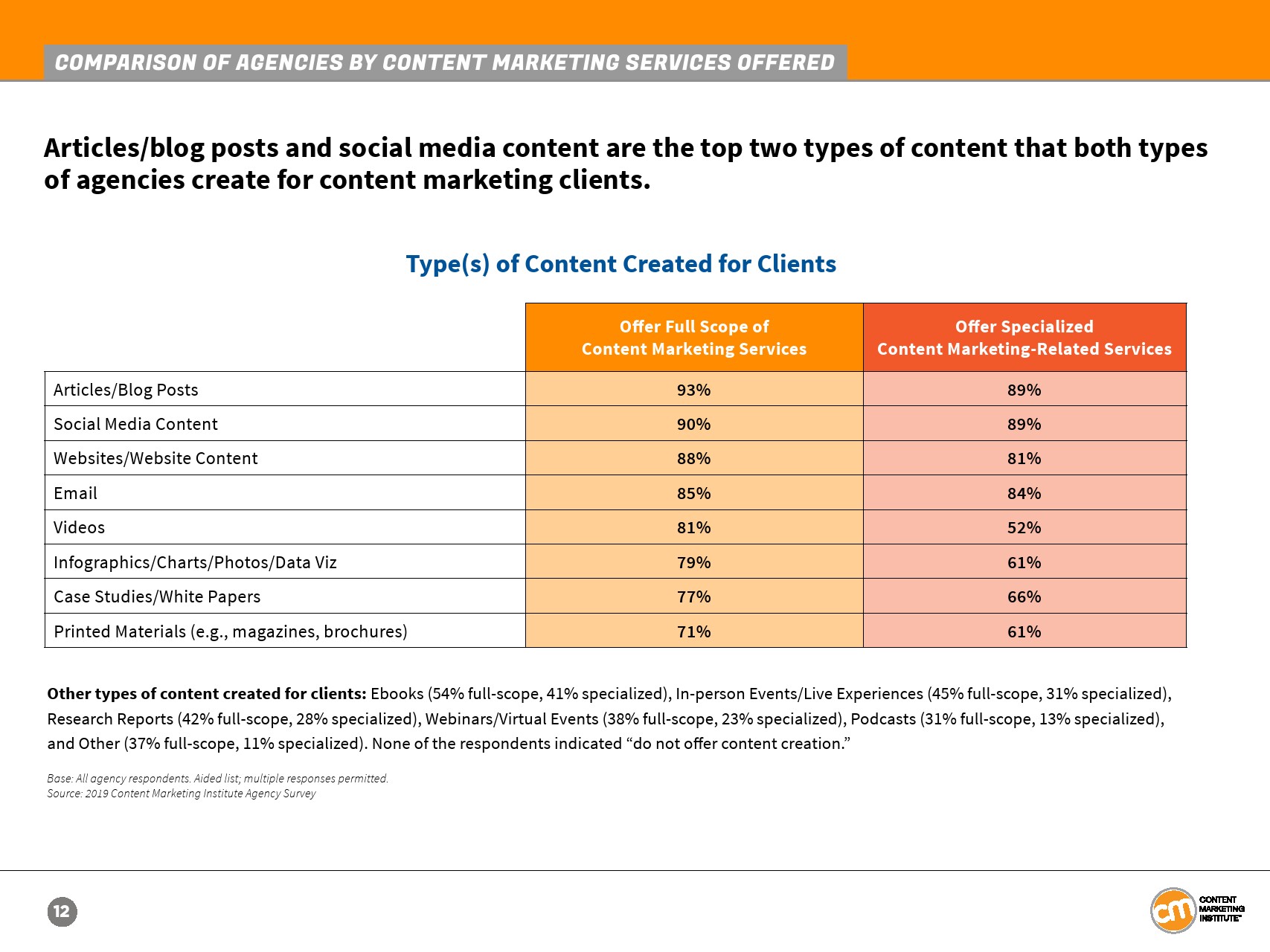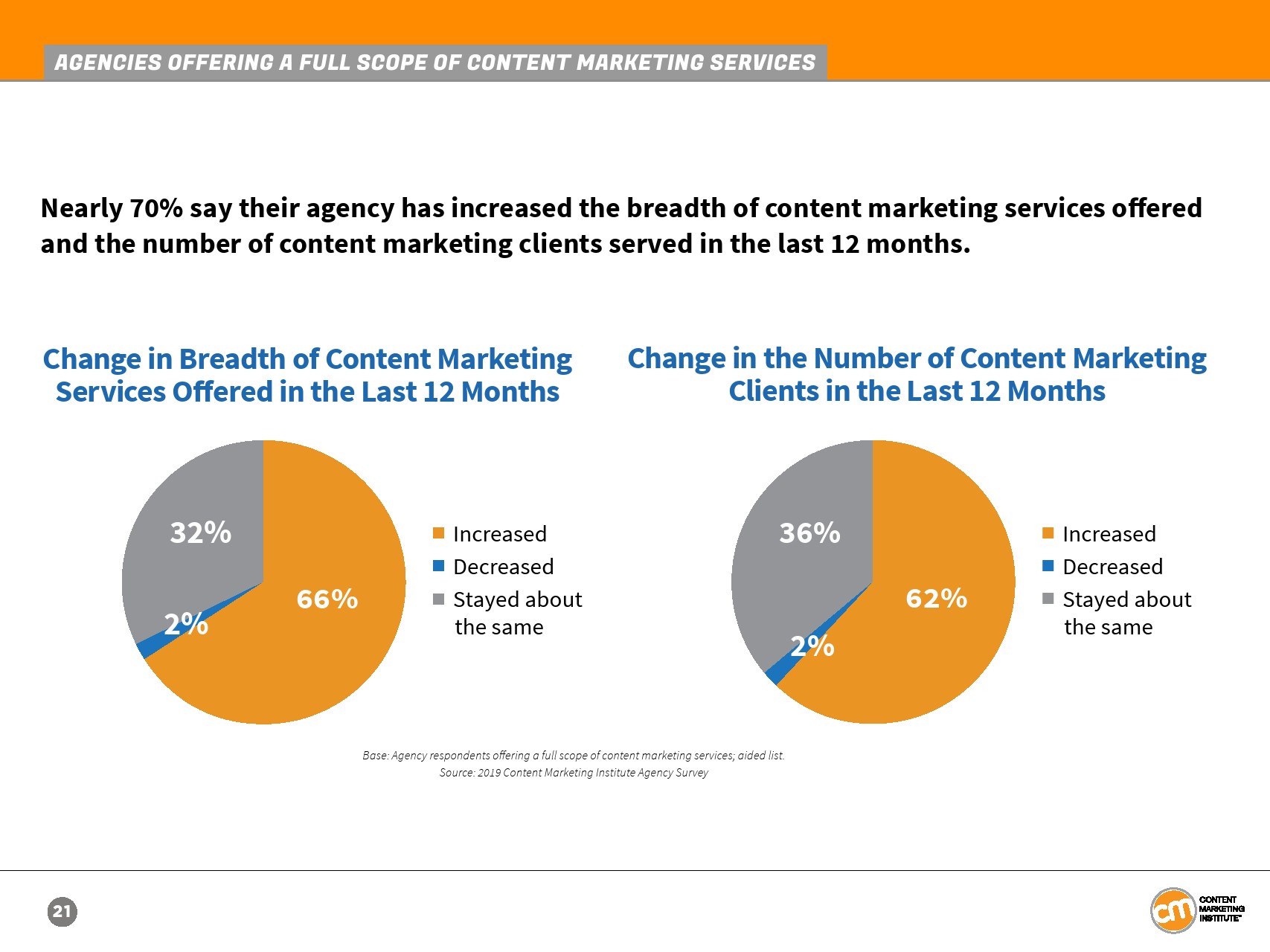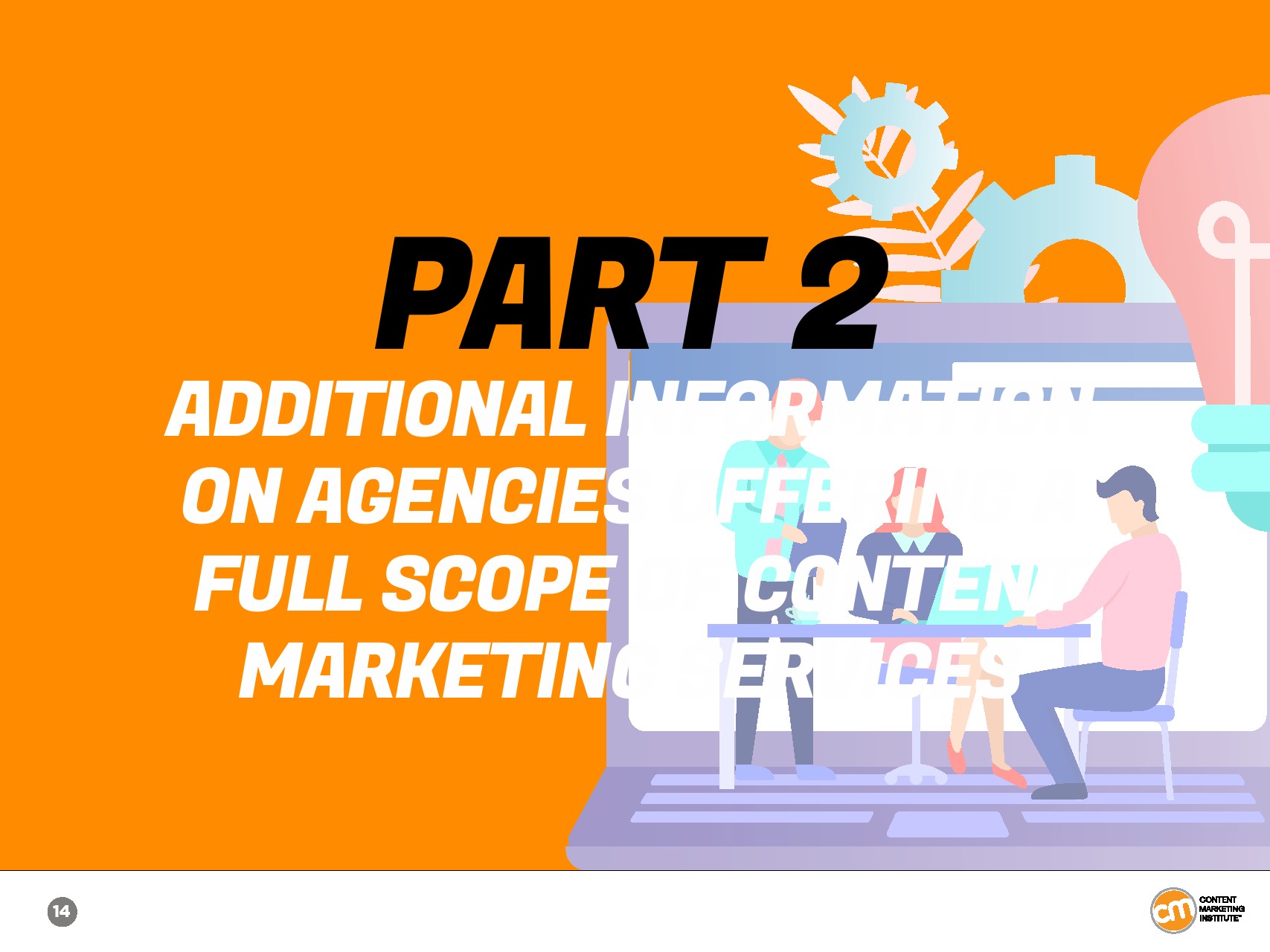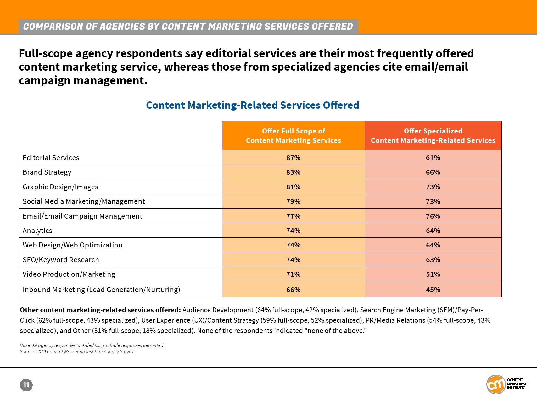 在接受调查的近200家机构中,61%的机构作为独立机构或大型机构的一部分提供全方位的内容营销服务。基本上所有剩余的受访者(37%)至少提供一项与内容营销相关的专业服务,如SEO、社交媒体、视频制作和电子邮件营销。约70%的全范围受访者表示,他们在过去一年中扩大了他们提供的内容营销服务的范围,以及他们服务的内容营销客户的数量。
