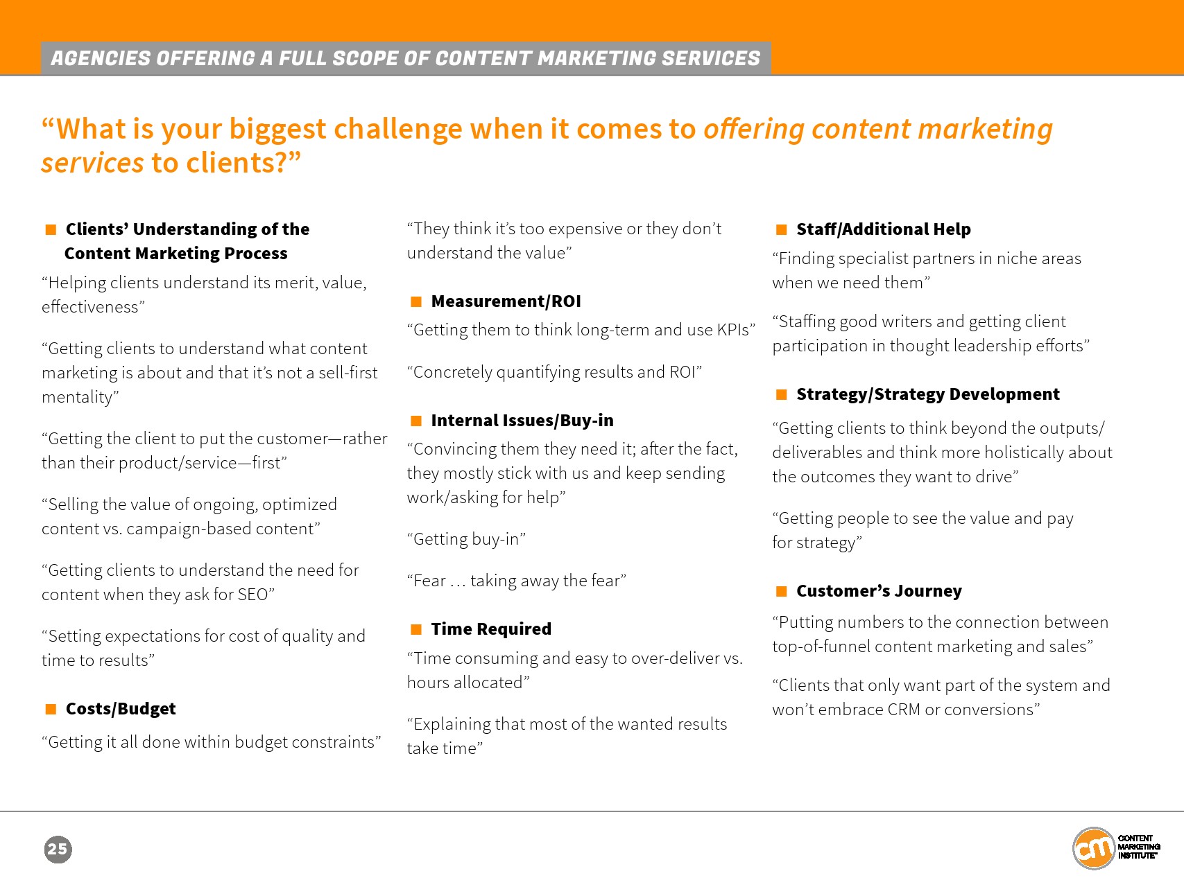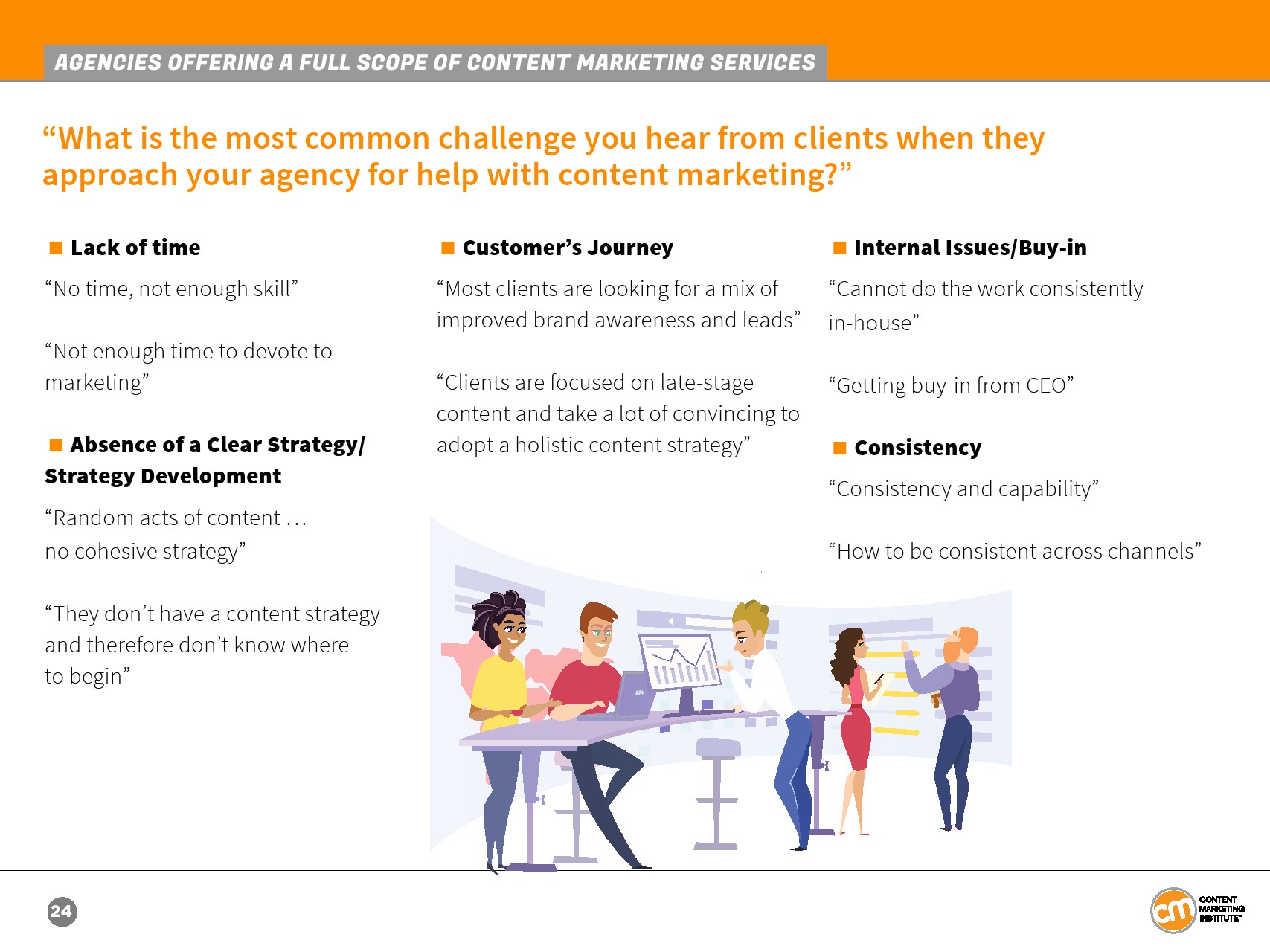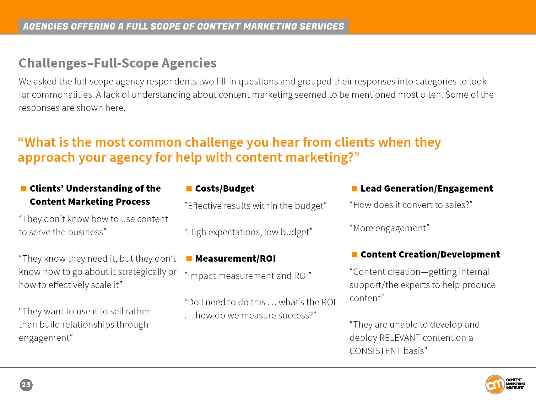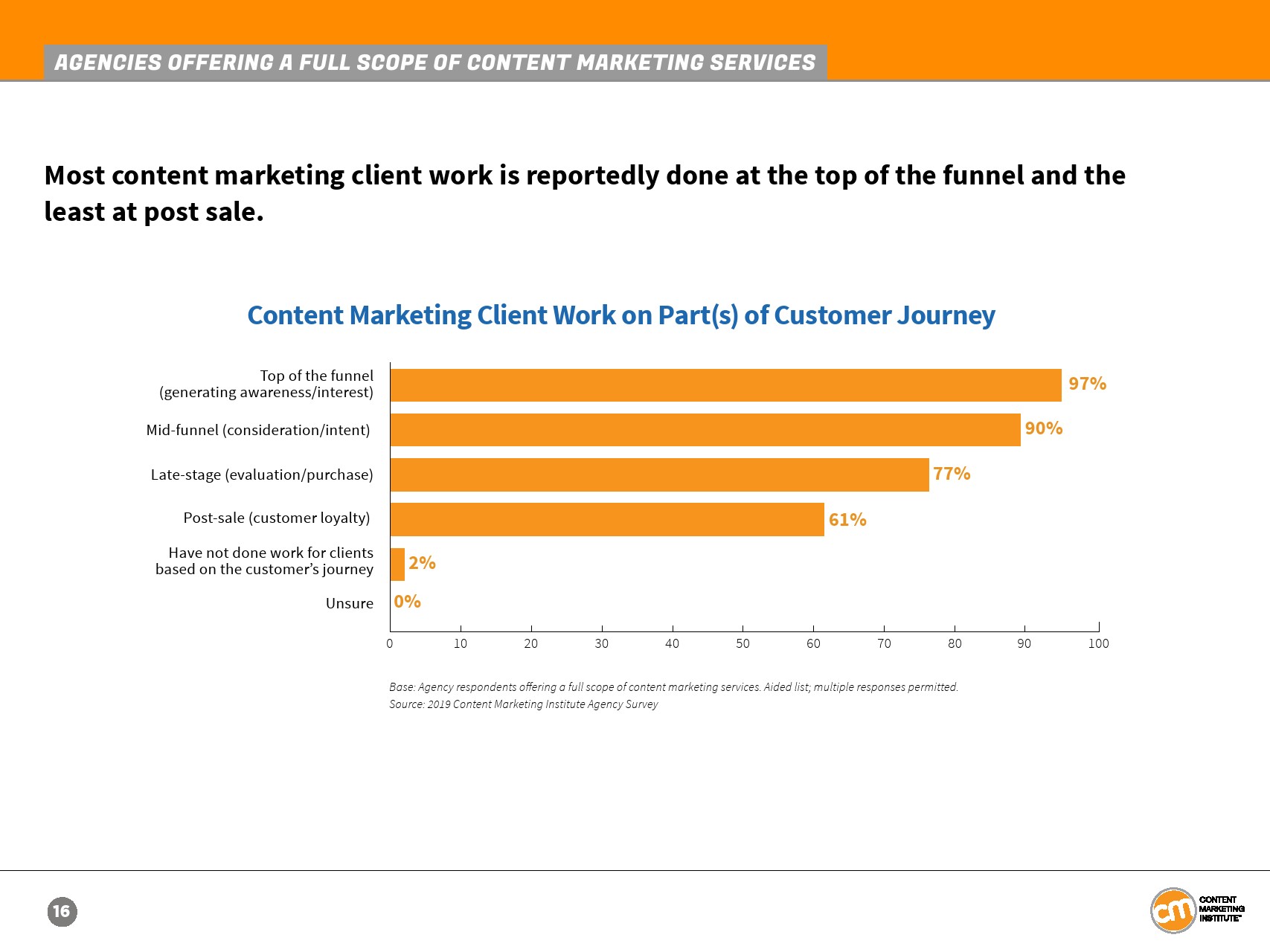 去年,CMI发现只有一半(47%)接受调查的B2B营销人员将他们的内容营销工作集中在购买周期的早期阶段。这项最新研究中几乎所有(97%)广告代理商都表示,他们为客户提供了顶尖的内容营销服务。中间漏斗工作的合同略少(90%),而在售后或客户保留活动中工作的机构则少得多(61%)。