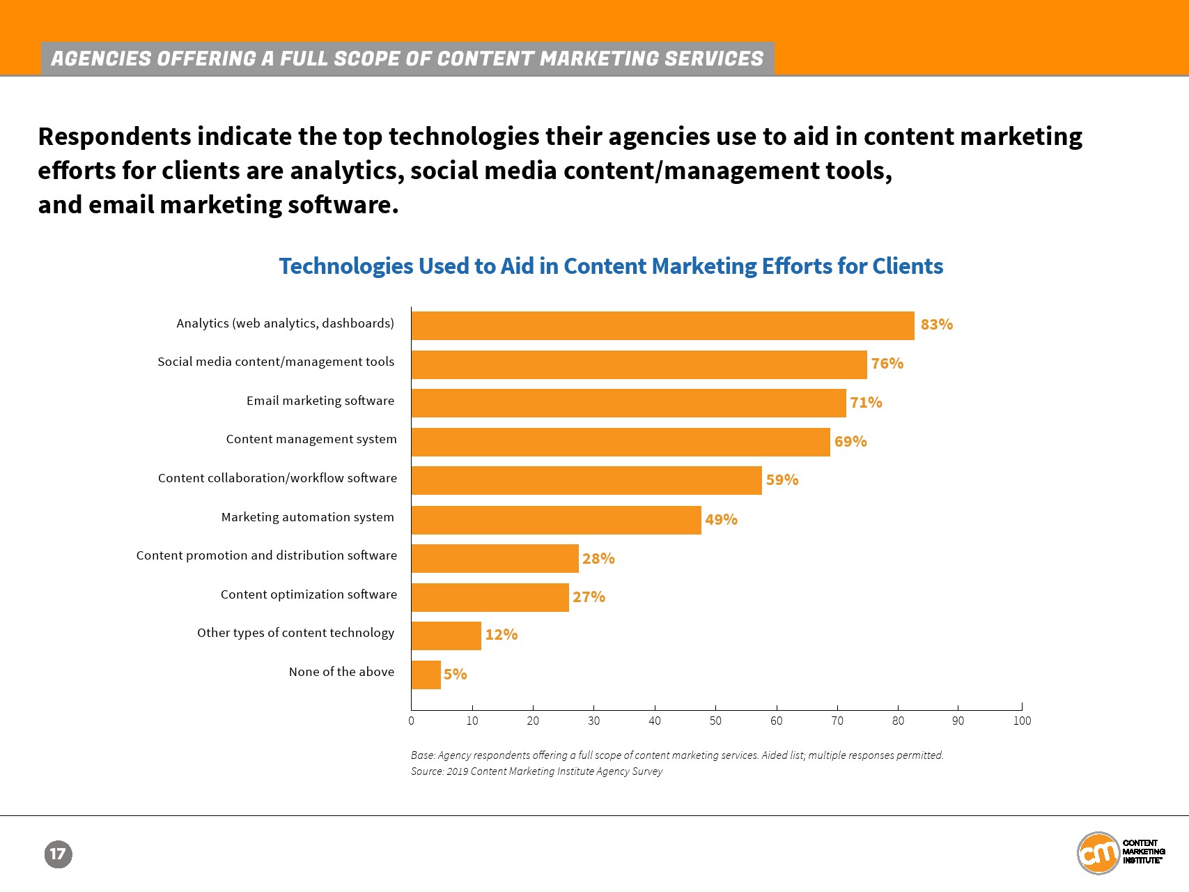 最新研究发现,绝大多数(83%)提供全方位内容营销服务的机构正在使用分析(即Web分析、仪表板)来帮助客户进行内容营销。另有3/4的受访者(76%)正在使用社交媒体内容/管理工具,71%正在使用电子邮件营销软件。