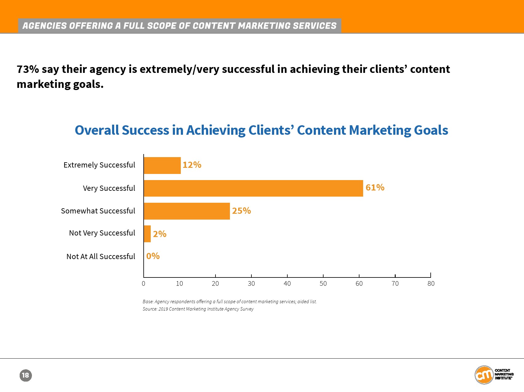好消息是,近3/4的受访者表示,在实现客户的内容营销目标方面,他们要么很成功(61%),要么非常成功(12%)。
