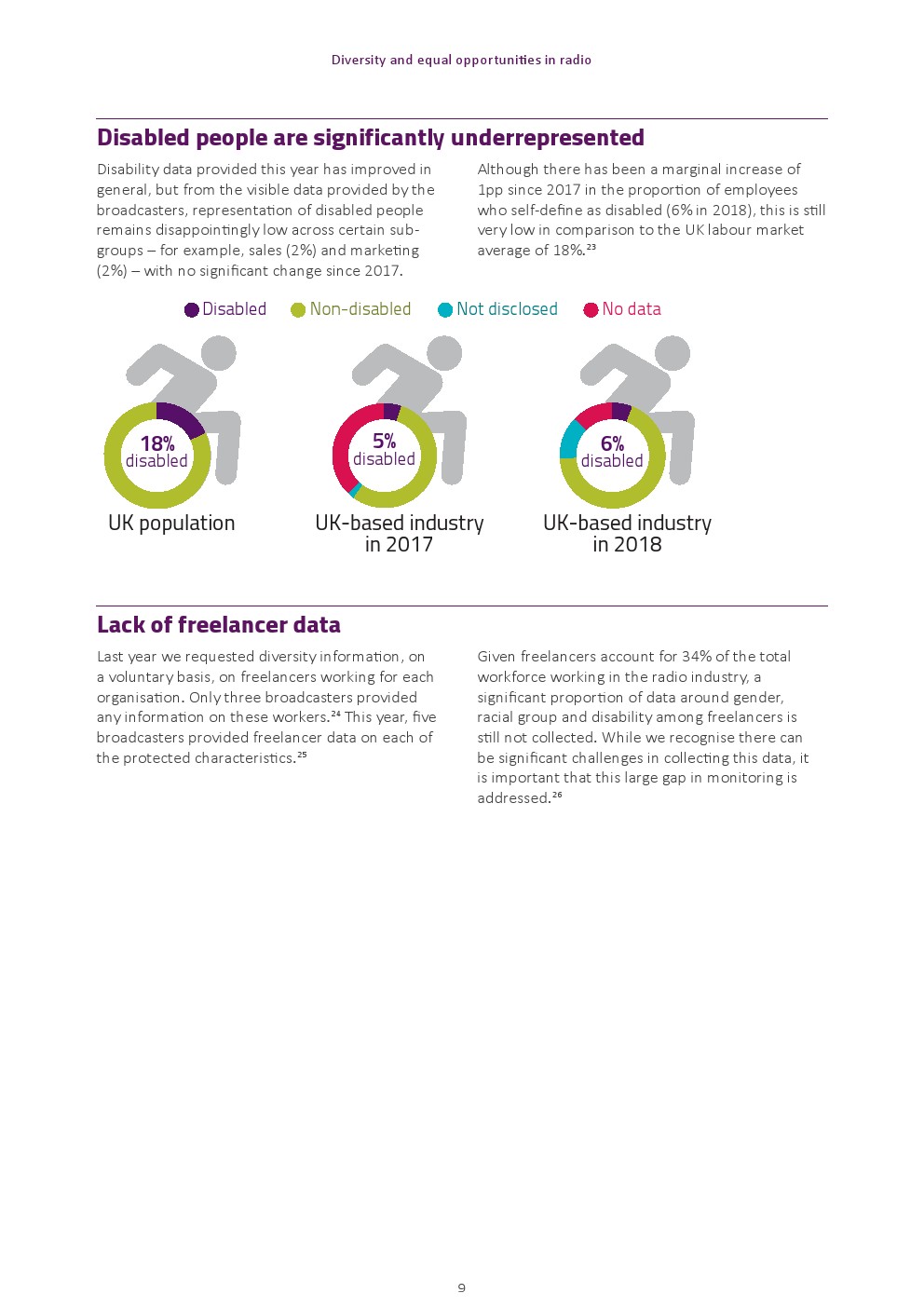 2018年,6%的电台员工自定义为残疾,自2017年以来略有增加(5%),远低于18%的英国平均水平。