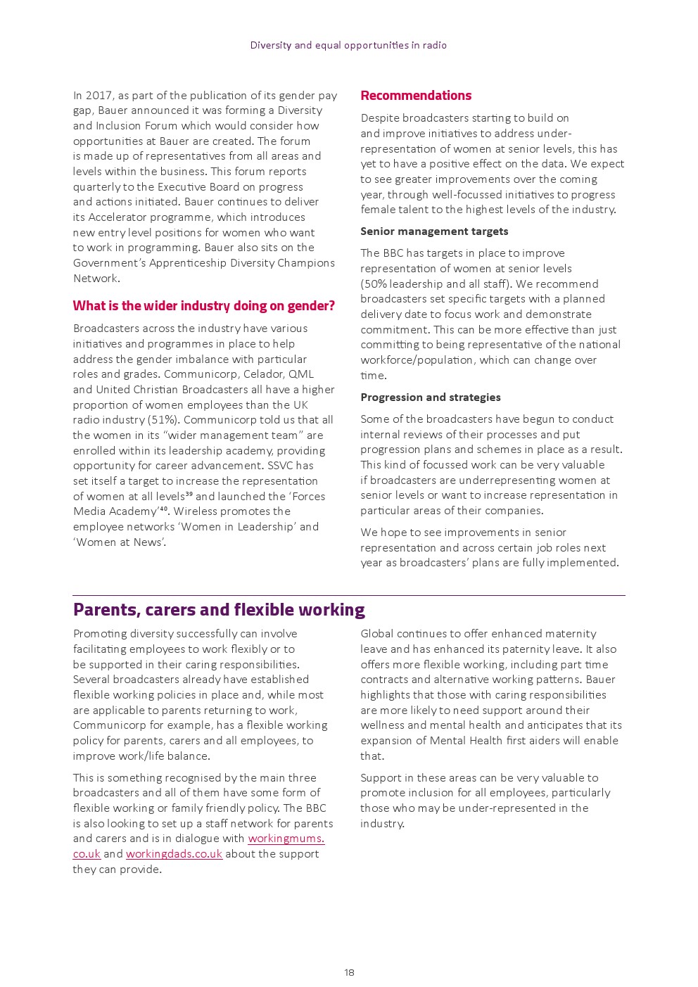处于顶端的性别差异。尽管整个电台的女性代表人数略高于英国劳动力市场(51% vs. 47%),但女性在高层的人数仍然不足(36%)。BBC电台的资深女性比例最高(40%),其次是Bauer(36%)和全球广播公司(30%)。