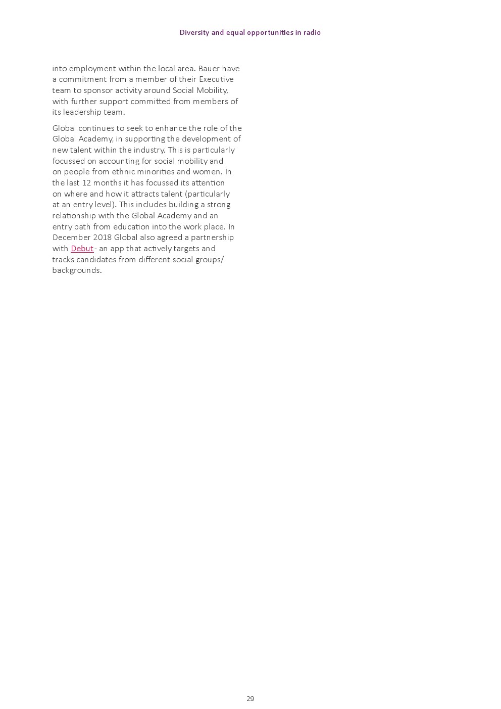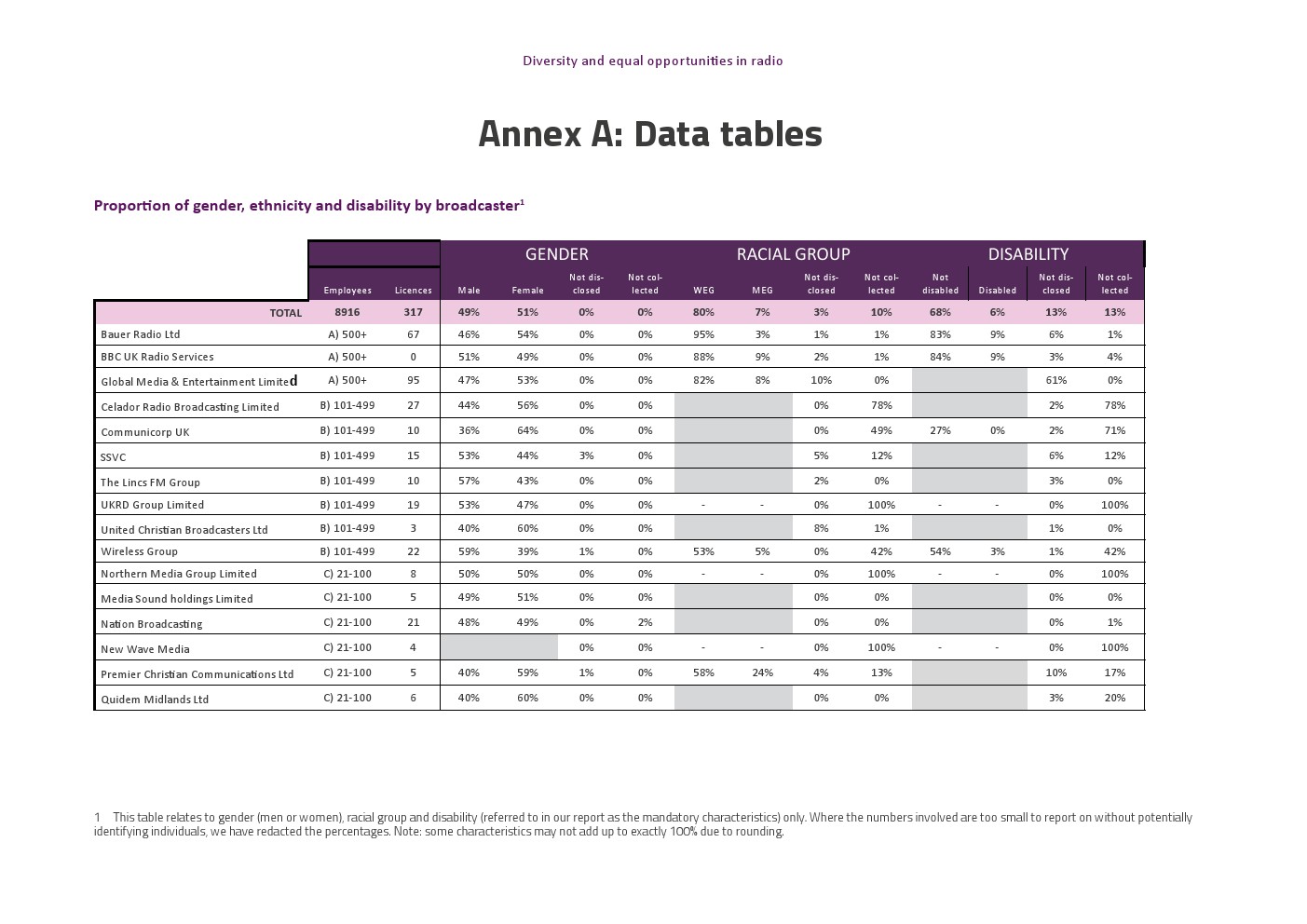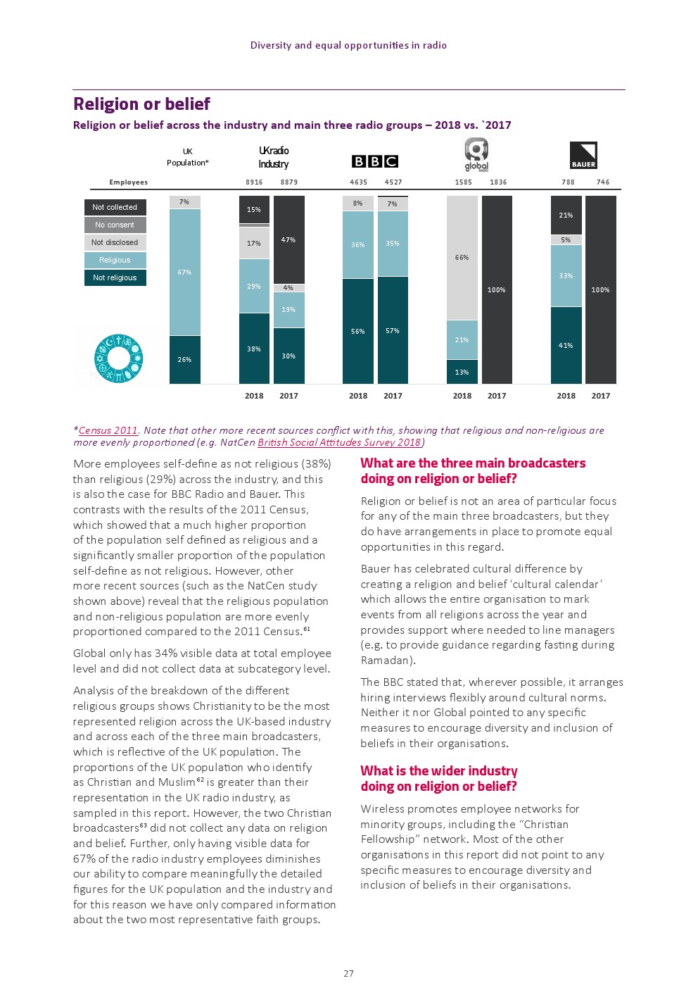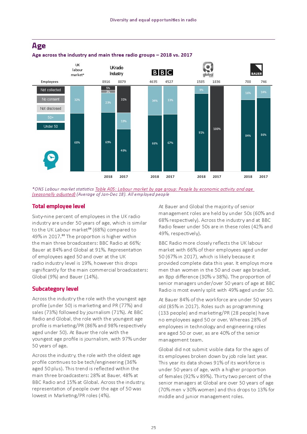 少数民族雇员代表性差。来自少数民族人口的代表比例为7%,远低于12%的英国平均水平。BBC广播公司(9%)和全球广播公司(8%)拥有最高的少数民族雇员比例,而Bauer(3%)的比例最低。