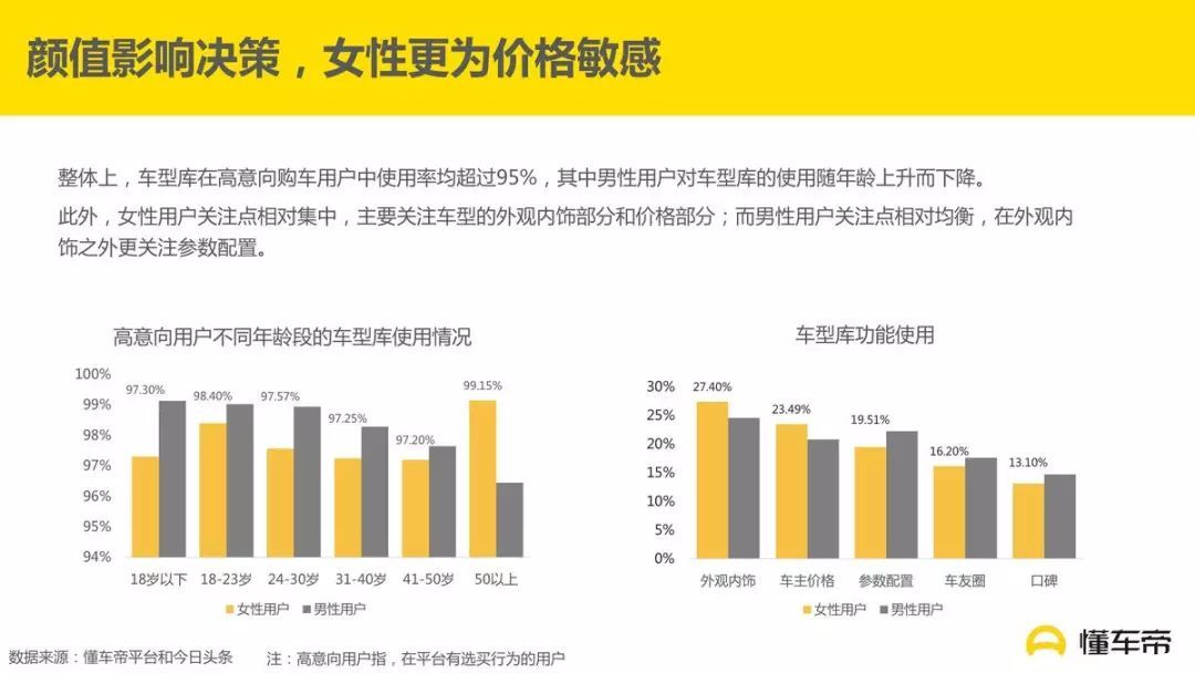 从报告可以看出,在车型关注点的分布上,高意向购车女性的关注点相对集中,她们更看重车型的“外观内饰”,其次是“车主价格”,“参数配置”相比于前两项则显得不那么重要。