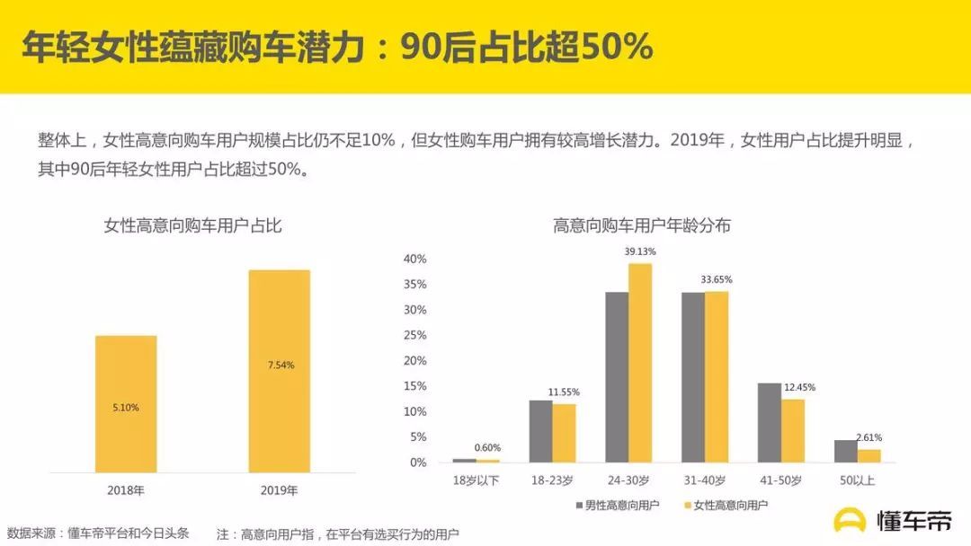2019年女性高意向购车用户占比7.54%,相比于去年的5.10%有所提升,说明女性的用车需求正日益增长。