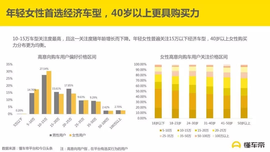 在价格选择层面,女性用户首选价格区间为10-15万的车型,这其中90后女性占主要部分,随着年龄增长,伴随而来的则是经济实力的增长,这个区间的关注度也逐渐下降,40岁以上女性购买力分布变得更为均衡。