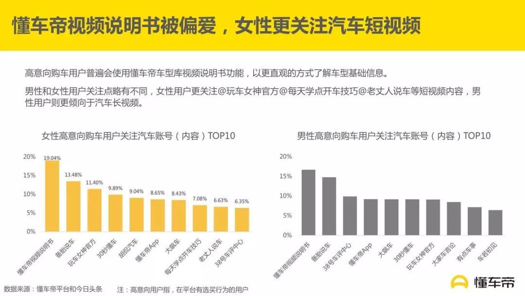 在视频类咨讯获取中,由于懂车帝视频说明书具有“简单实用”“直击痛点”的特点,成为所有高意向购车用户了解车型基础信息的首选,除此之外,女性用户更关注偏“驾驶技能”“用车常识”类的竖版短视频内容,这点与男性倾向于汽车长视频有所不同。