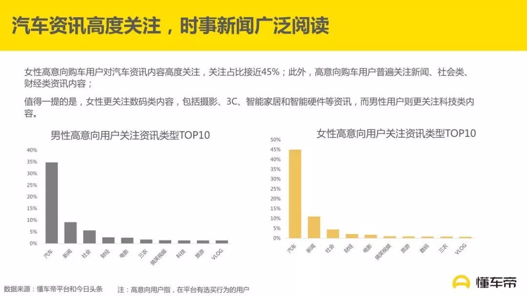 而在所有资讯类别中,高意向购车用户的共通点是对汽车资讯持有高度关注,新闻、社会类资讯进行广泛阅读,不同点则是女性相对于男性对数码类内容持有更高的兴趣。