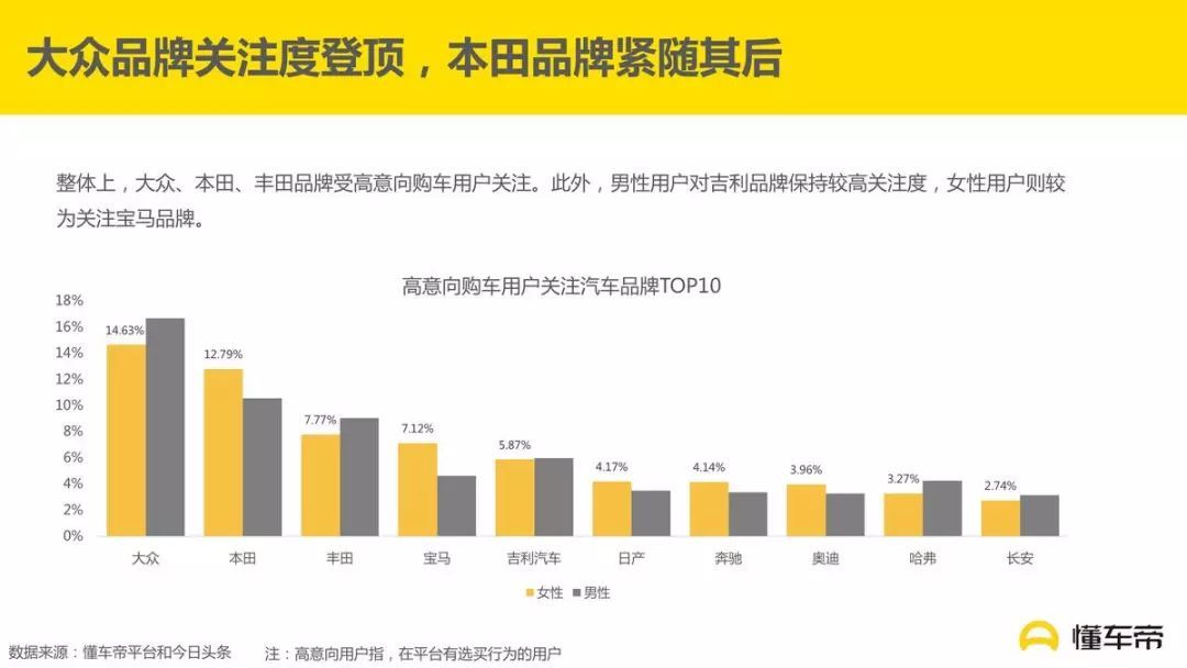在品牌选择层面,“大众”“本田”“丰田”的品牌关注度位列前三甲,“吉利汽车”位居自主品牌关注度榜首。