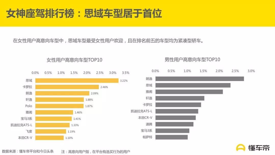 在车型选择层面,女性用户高意向车型中,紧凑型轿车占据排行榜前十的半壁江山,“思域”“卡罗拉”“朗逸”喜提最受欢迎车型前三甲。