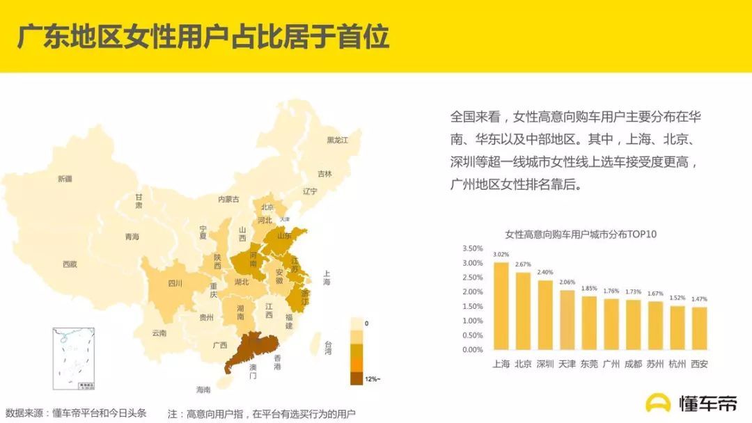 虽然近年来二线及以下城市的消费能力和水平正在崛起,但在女性高意向购车用户中,大部分还是来自于“上、北、深”等超一线城市,东莞、广州等城市紧随其后,综合来看,广东省是高意向购车用户大省。