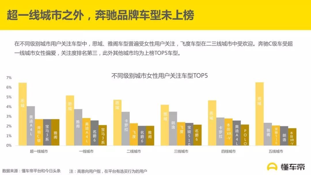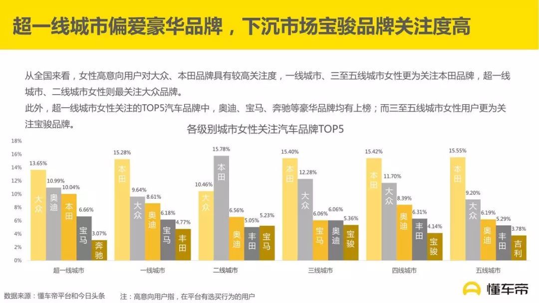 一线及超一线城市,女性高意向购车用户对德系品牌及日系品牌颇为青睐,大众、宝马、奔驰、奥迪、本田、丰田均上榜,而在三线至五线城市中,国产品牌开始逐渐占据一席之地,宝骏吉利等均有上榜。