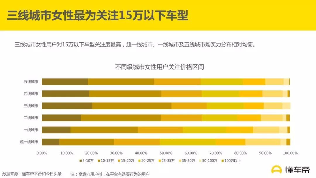 在一线城市之上的“超一线城市”,汽车消费者的购买能力更高,偏爱豪华品牌,50万及以上的豪车车型选择占比高于二线及以下城市,三线城市女性最为关注15万以下车型。