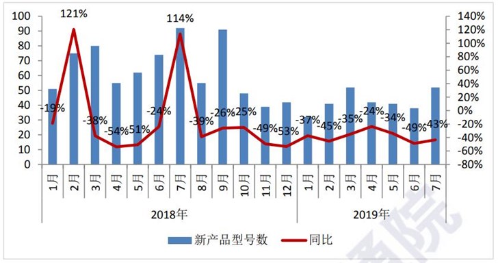 国内手机市场上市新机型数量。2019年7月,上市新机型52款,同比下降43.5%,含2G手机16款、4G手机32款、5G手机4款;2019年1-7月,上市新机型298款,同比下降39.1%,含2G手机63款、3G手机1款,4G手机229款、5G手机5款。